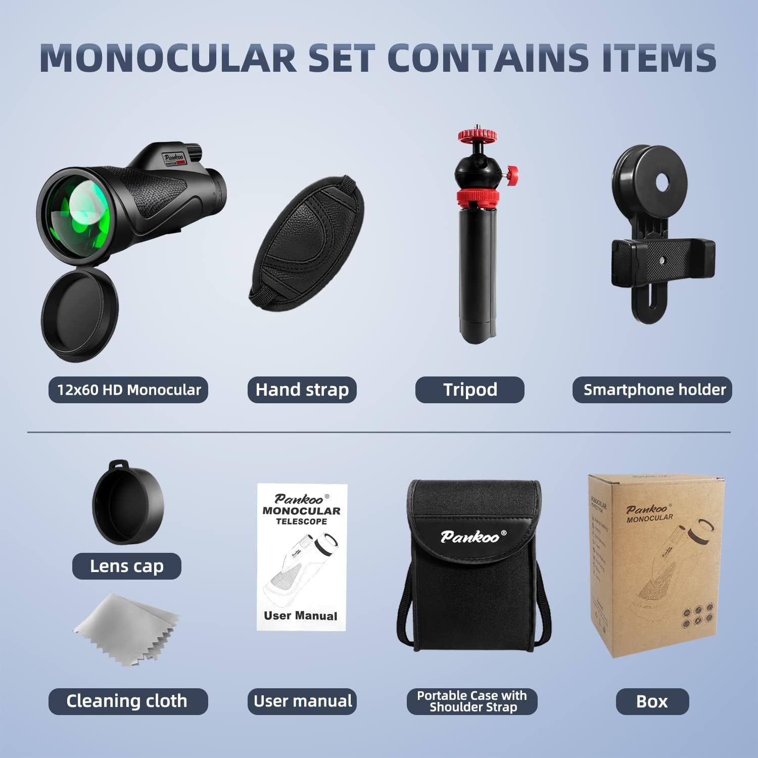 【12x High Power Wide Angle Monocular】Pankoo 12×60 HD monocular has 12x magnification and 6.5°wide field of view monocular, which provides a more comfortable and larger view, clearer details, adding up to incomparable watching experience. Perfect for Hiking, Camping, Bird Watching, Wildlife, Sports, Concerts, Travel, Scenery Watching.