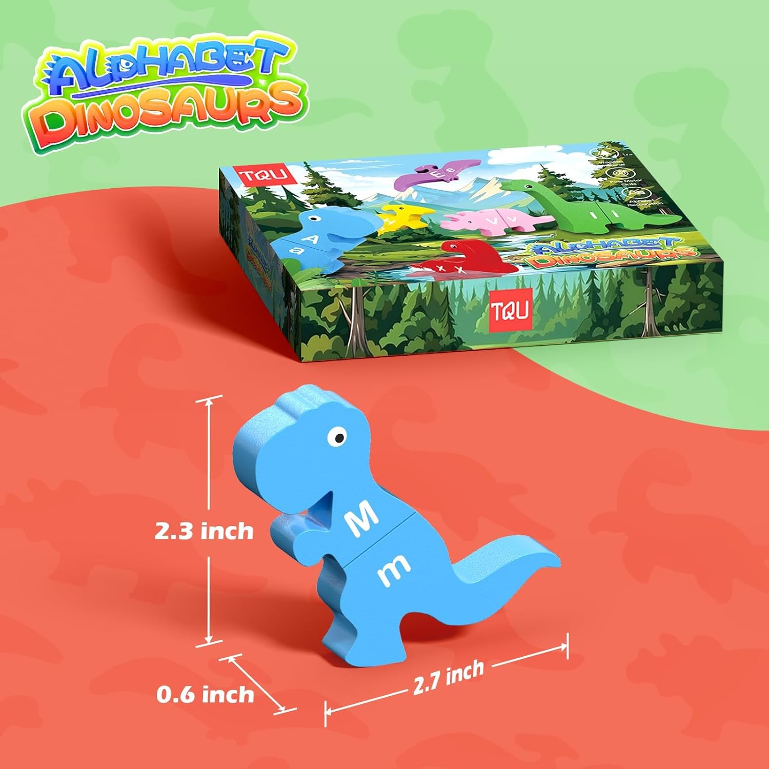 【Letter Matching Set】The dinosaur learning toys come in a great value set with 26 letters on 13 double sides dinosaurs. There are 6 types of dinosaurs: Tyrannosaurus Rex, Brontosaurus, Triceratops, Plesiosaur, Pterosaur, and Hadrosaurus. Each dinosaur has two pairs of uppercase and lowercase letters.