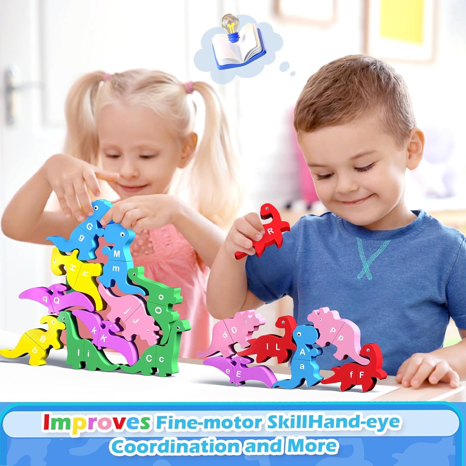 The kids can pick color sorting skills and master the basic alphabet required for early learning. The dinosaur parts are made of wood and comfortable to hold and have no sharp edges. Each dinosaur is perfectly designed to fit small hands, easy to hold for kids.