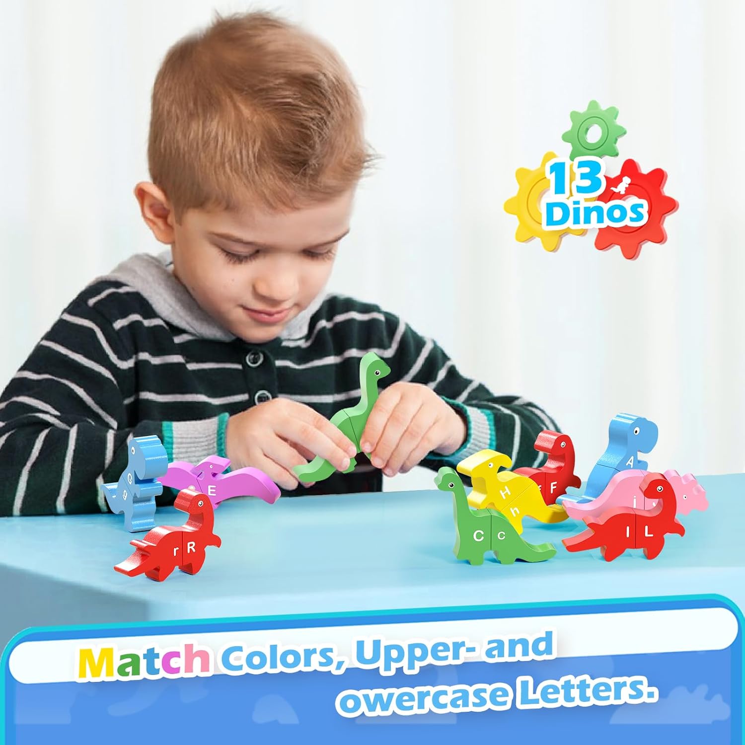 Recognize and understand different types of dinosaurs Color recognition and matching of uppercase and lowercase lettersStacking gameMagnetic game