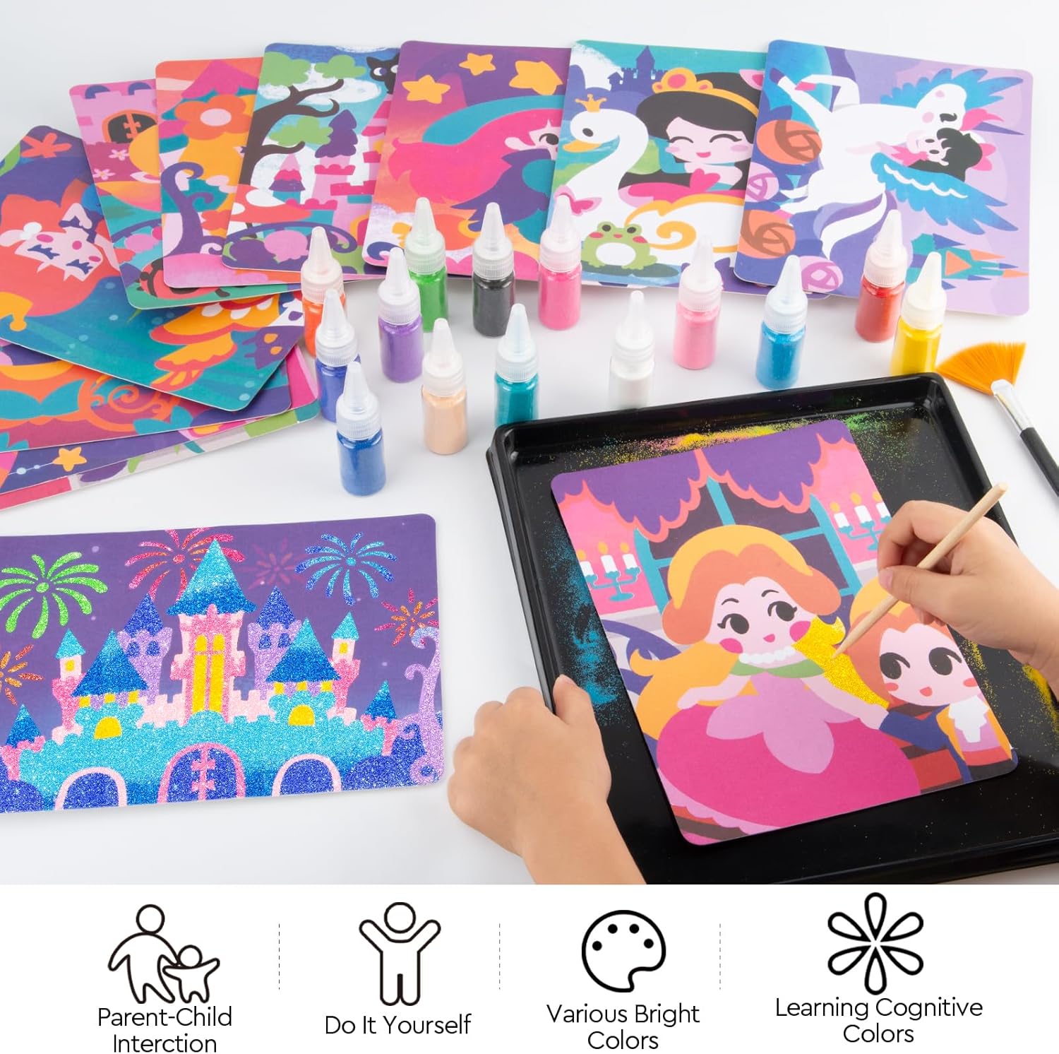 【Great craft gifts】Ideal for ages 6-8, this enchanting sand art kit featuring princesses, castles, unicorns, and magical themes makes a delightful gift for birthdays, holidays, Christmas, or parties. It encourages creativity and imaginative play without screens