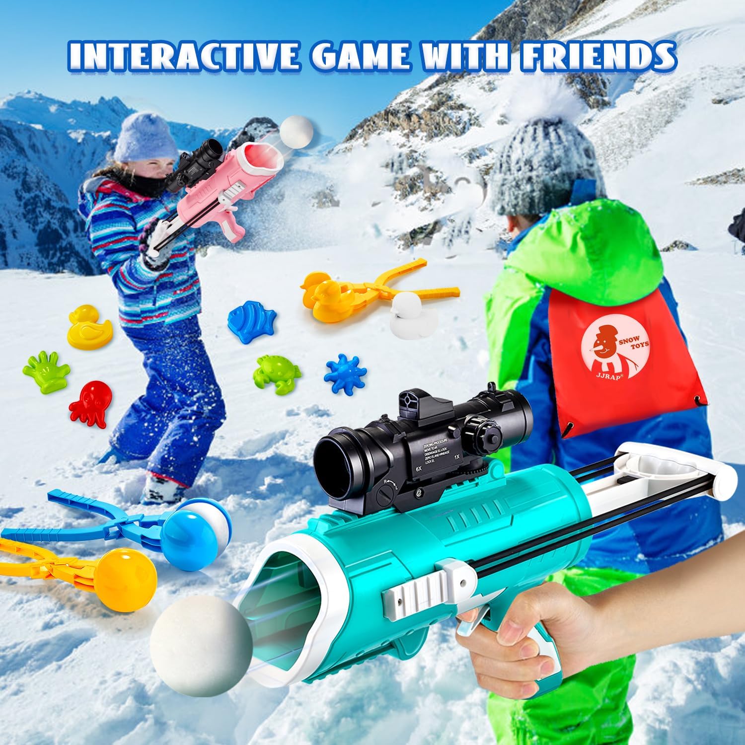 Great Value Upgrade Kit: JJRAP snow toy kit including 2 Snowball Blaster Gun, 2 popular duck snowball makers, 4 round snowball maker, 1 snow shovel, 4 ice cream sand molds, 1 triangle snow spade, 1 spatula, 6 animal sand molds and a storage bag.