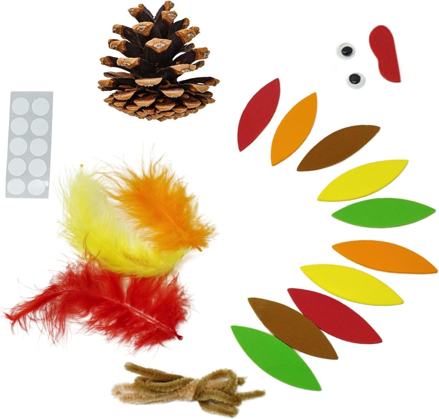 A FEATHERED MASTERPIECE: From turkey projects for kids to fun-filled crafting for adults, this kit offers everything you need to create your own turkey masterpiece. With self-adhesive feathers, pipe cleaners, real pinecones, and googly eyes, assembling your turkey is a breeze. No extra supplies needed, making it a perfect group activity for Thanksgiving celebrations!