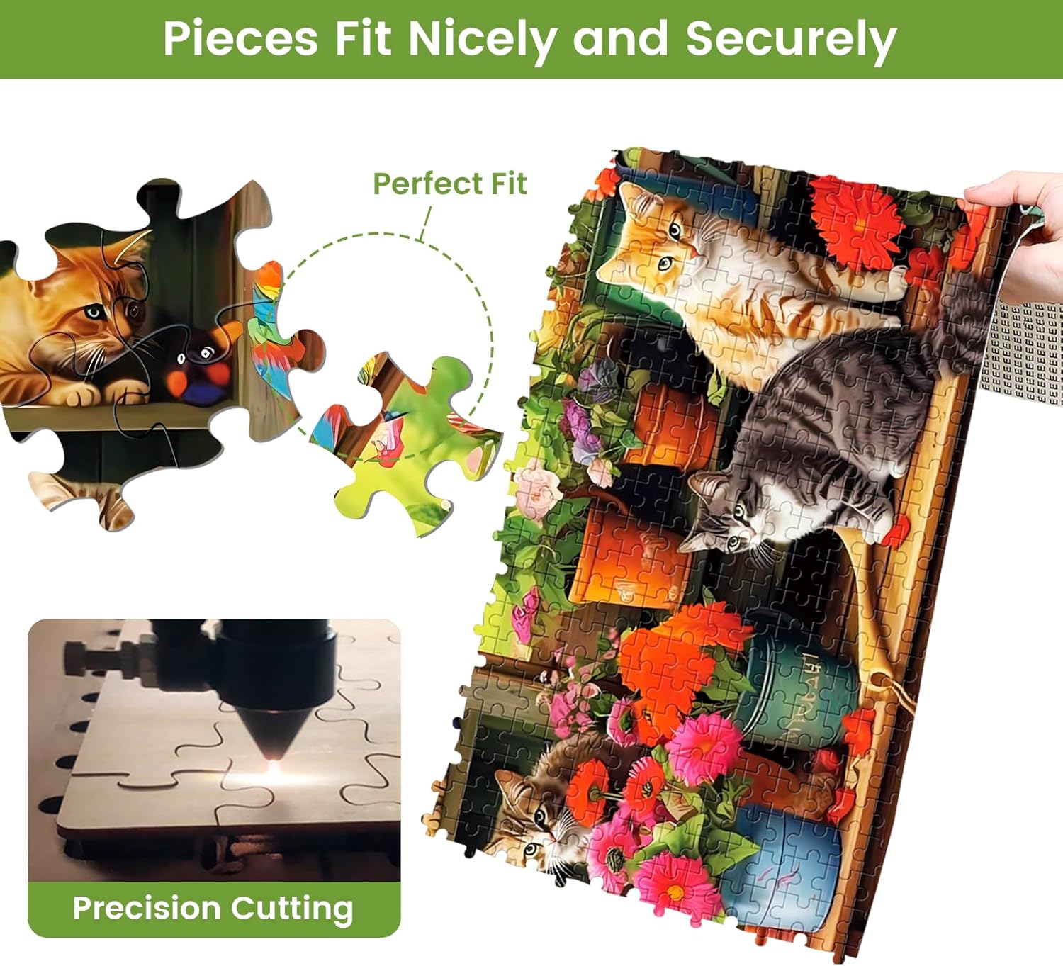 Great Challenge: The Cats puzzle is 500 pieces worthy of any puzzler. The colorful image of the cats are playing on the table in flower room makes the whole puzzle full of joy, which is definitely a challenge for those who are fanatical lovers of puzzles!