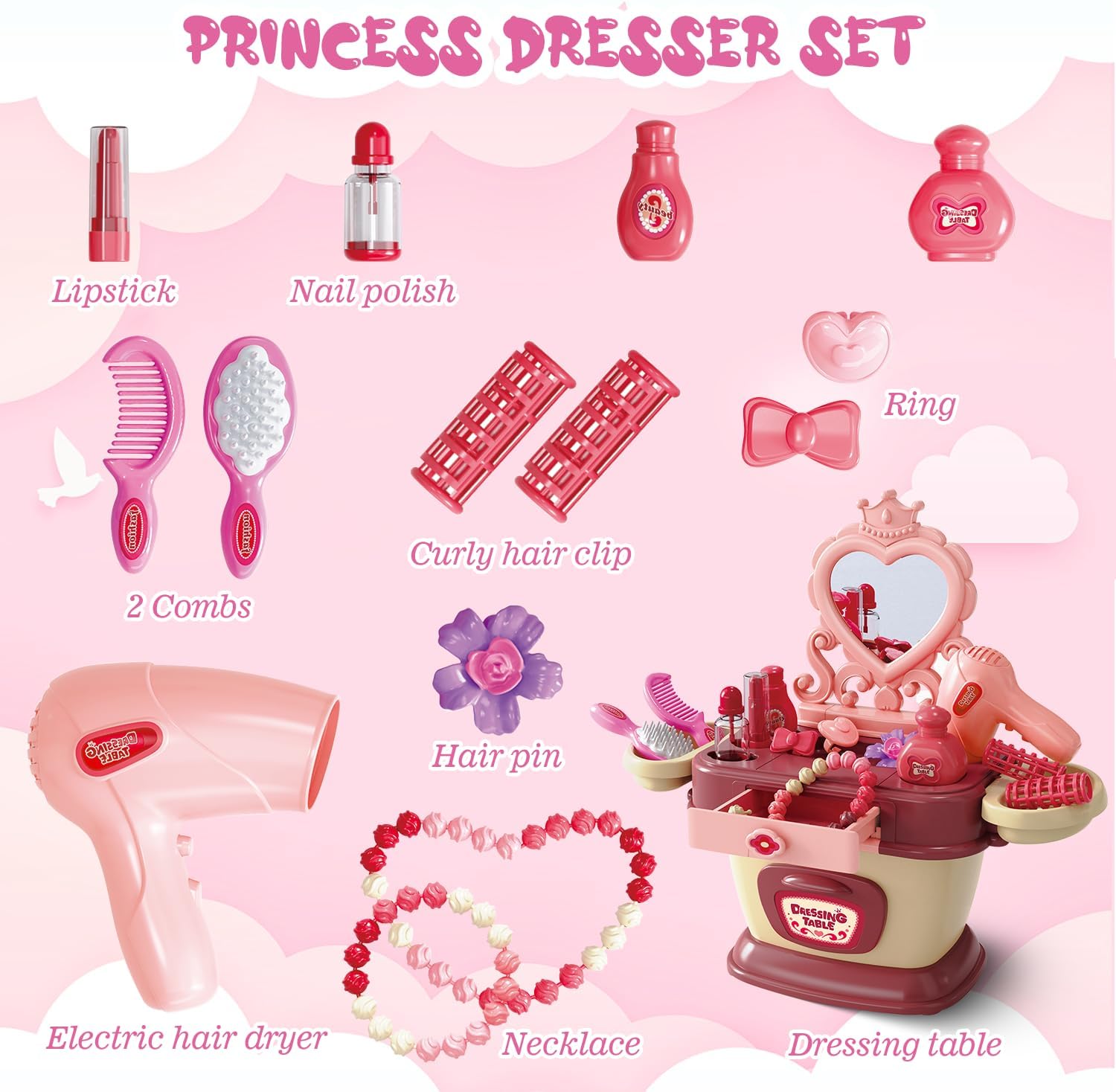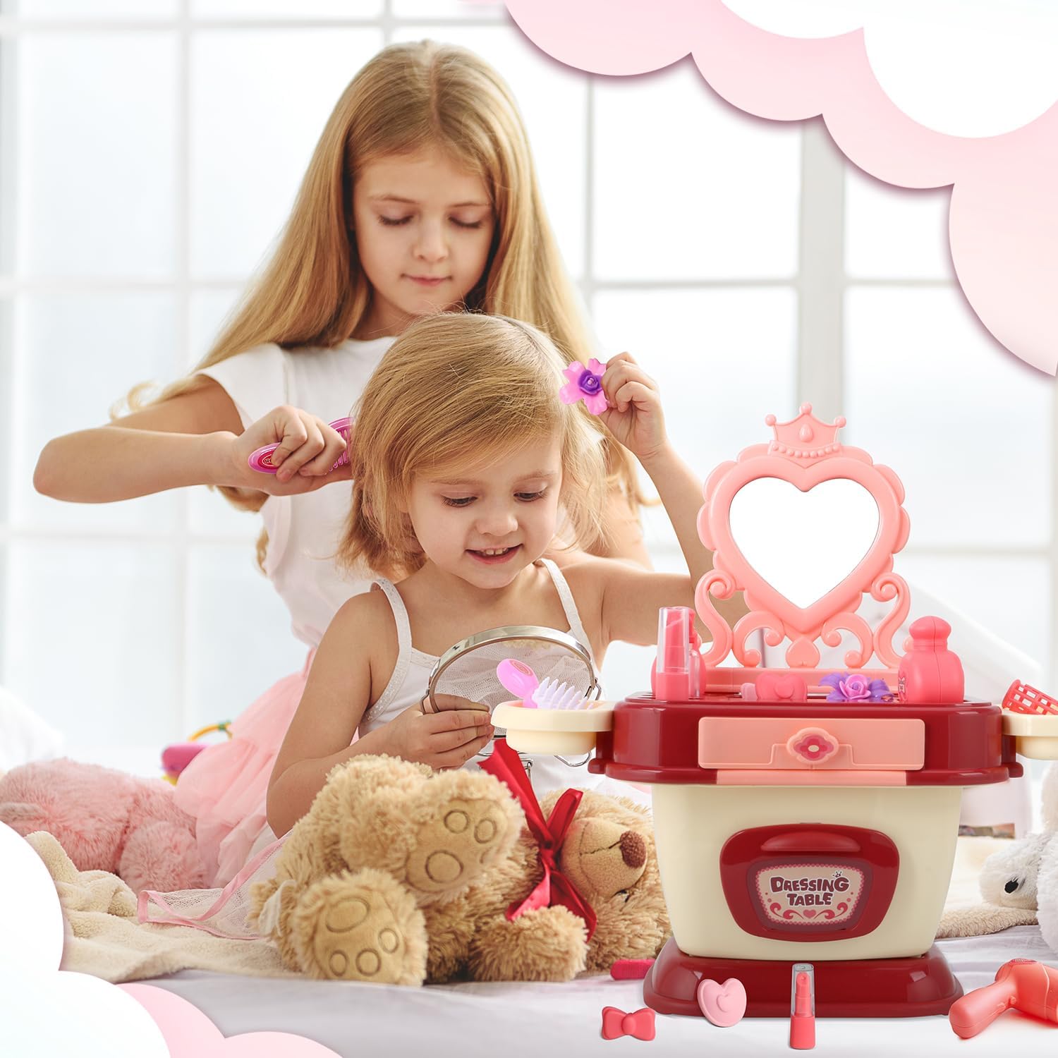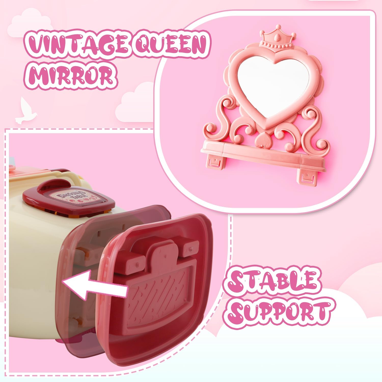 【Standing Storage + Vintage Heart-Shaped Mirror Design】- The princess pretend play girls toys include a standing storage unit and a charming vintage heart-shaped mirror, offering a stylish and functional salon setup that kids will adore. The standing storage keeps all accessories organized and within easy reach