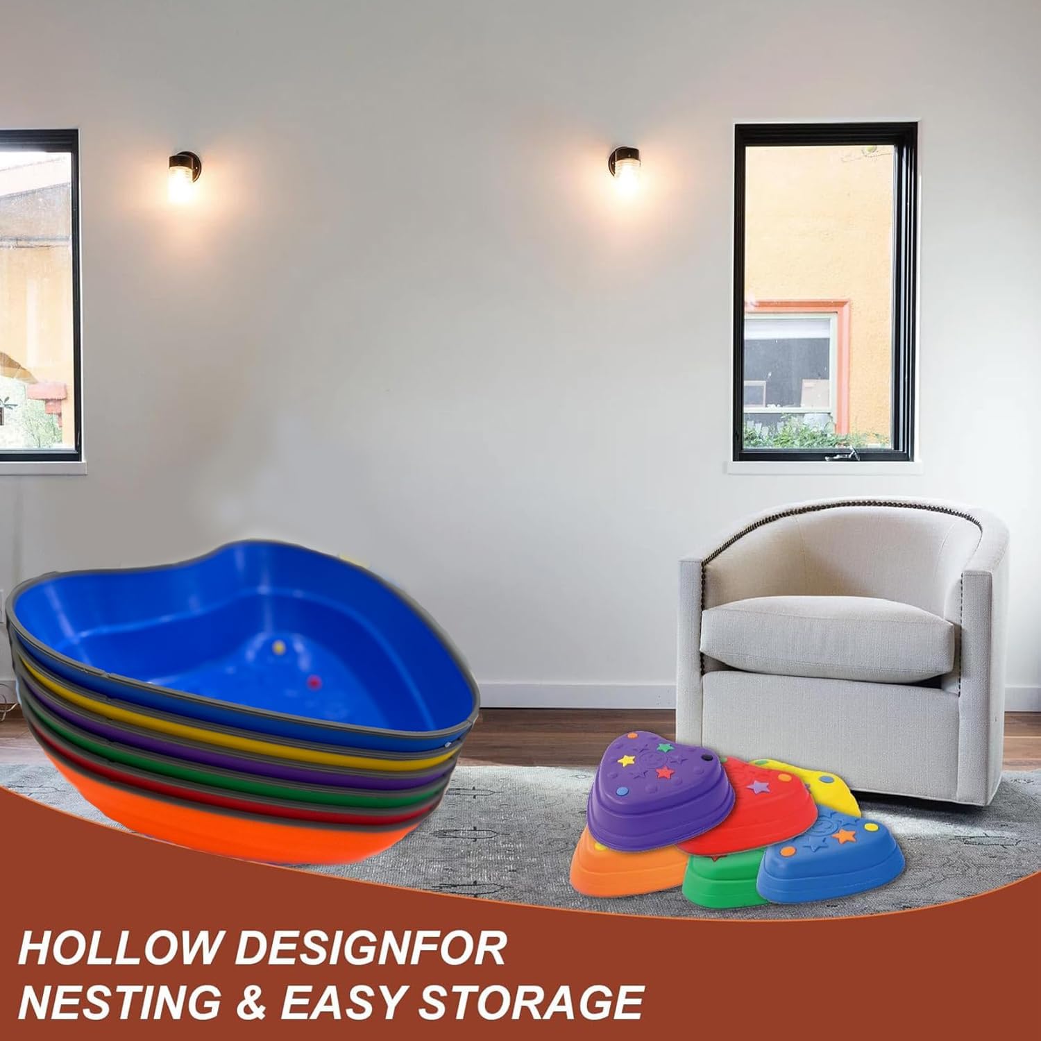 SUPER VALUE PACK. Our Coordination Play Toy includes 6 Packs Steps Balance Heart-Shaped Jumping Stones Equipment for Kids Ages 3+,Each stepping stone is made of Using non-toxic and odorless healthy PP material with non-slip edging and stackable for easy storage. Shell weight limit should not exceed 270 lbs.