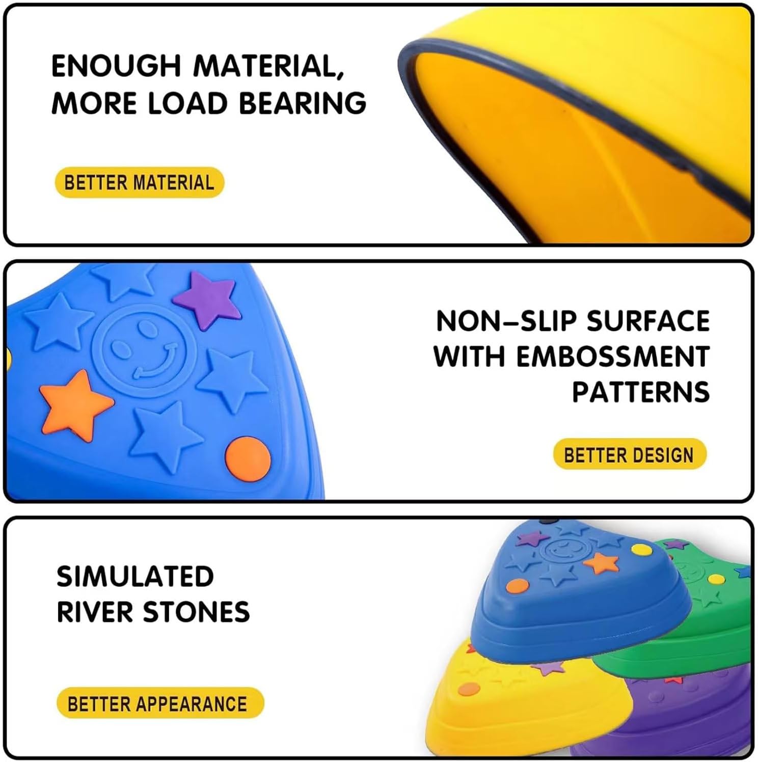 SAFETY GUARANTEE WITH NON-SLIP BOTTOM:Designed With non-slip silicone edge and texture surface paired with a sturdy triangular design, that can increase the friction atop carpet,tile,grass,hardwood floors,etc,to ensure the kids’ safety. These stones are made of child safe durable polyurethane, which are non-toxic and odorless to protect kids’ health.