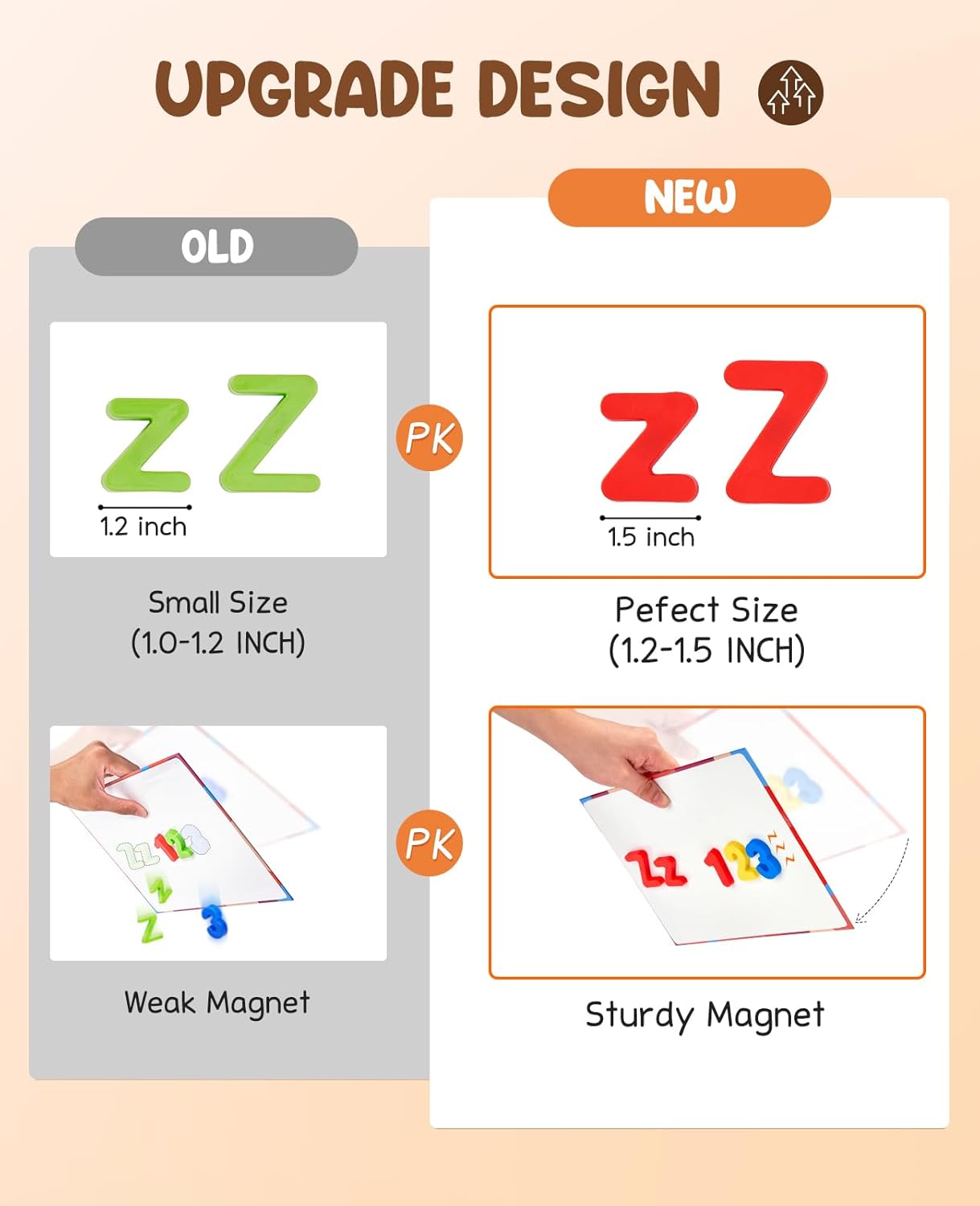 Upgraded Feature: For better grip for little kids, our magnetic alphabet letters and numbers have increased the size of the letters to 1.2in -1.5in with a more advanced matte texture. The larger size fits perfectly in the little hands of toddlers. We also upgrade the magnet to make it more robust and not easy to fall off, all for long-term use.