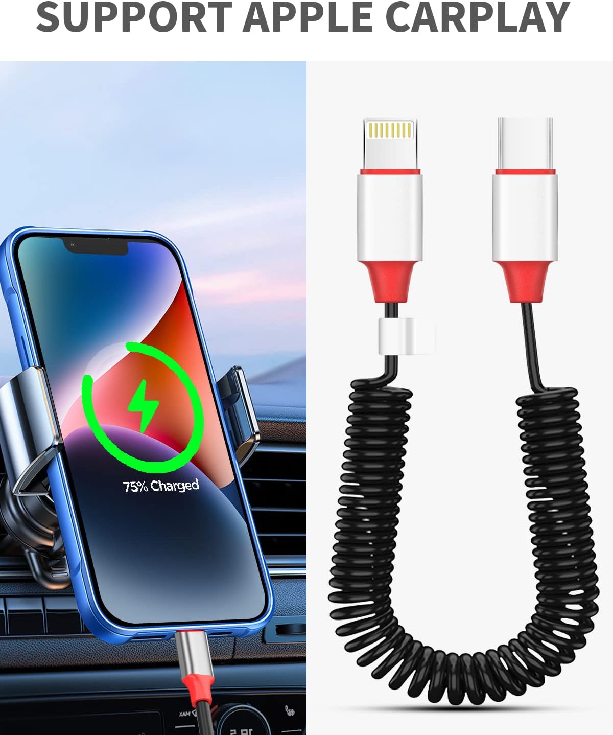 SUPPORT A-PPLE CARPLAY: This coiled iPhone lightning cable has a great solution for charging your phone in the car and supports Apple CarPlay. MFi certified for A pple l ightning devices.