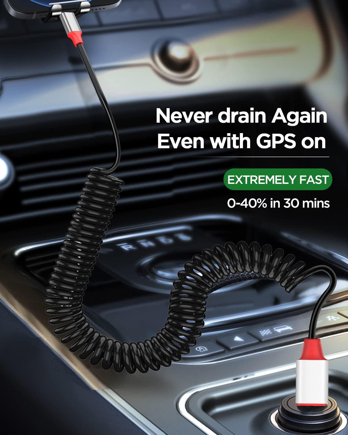 AICase Coiled USB C to L ightning 6A Cable provides the perfect length for connecting a smartphone to a car charger without tangled cable mess.