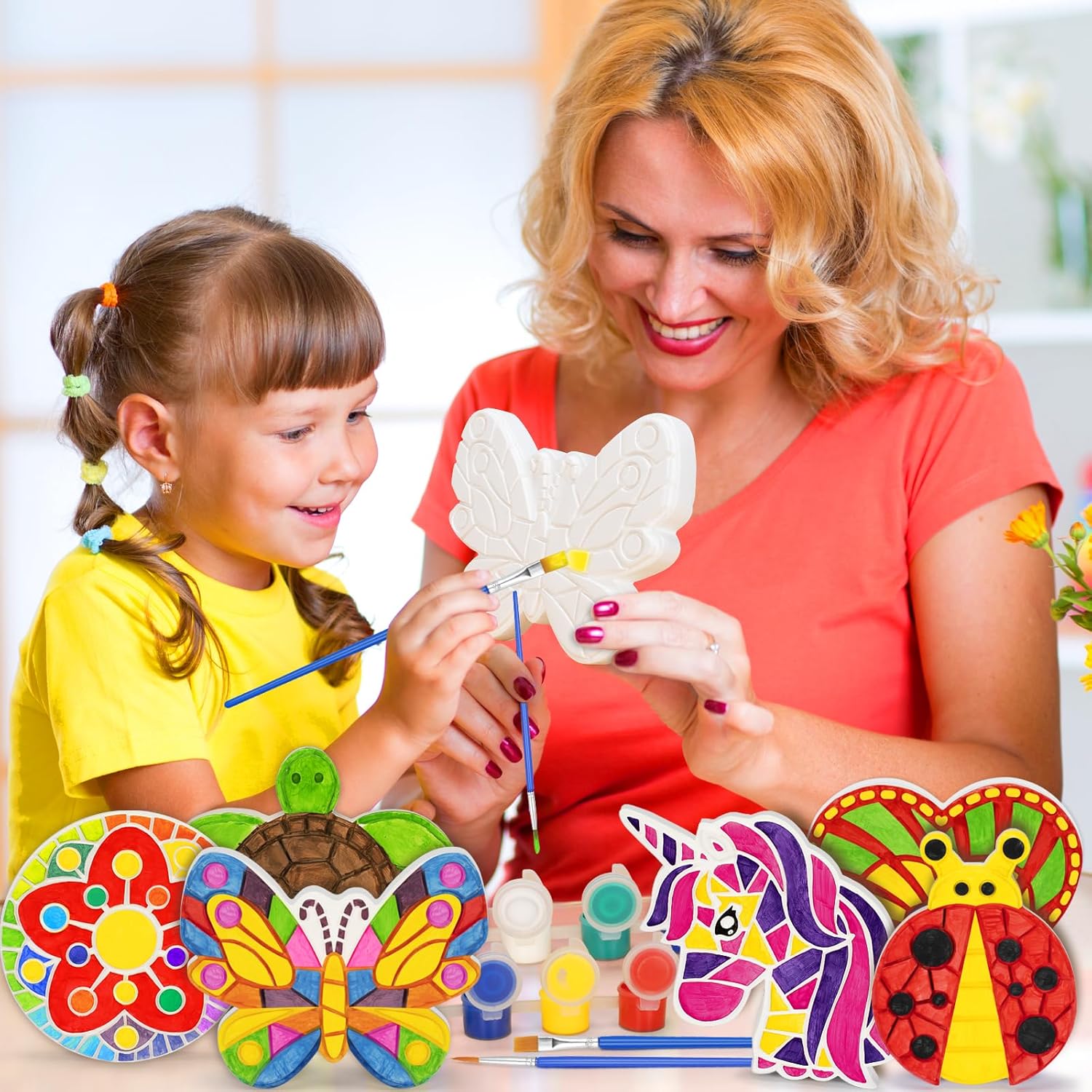 Arts & Craft Activity Supplies: White plasters in 6 different shapes provide unlimited designs, including kids favorite unicorn, turtle, ladybug, flower, butterfly and heart. Includes 6 brushes and 6 color paint sets, enough accessories for kids to create what they love.