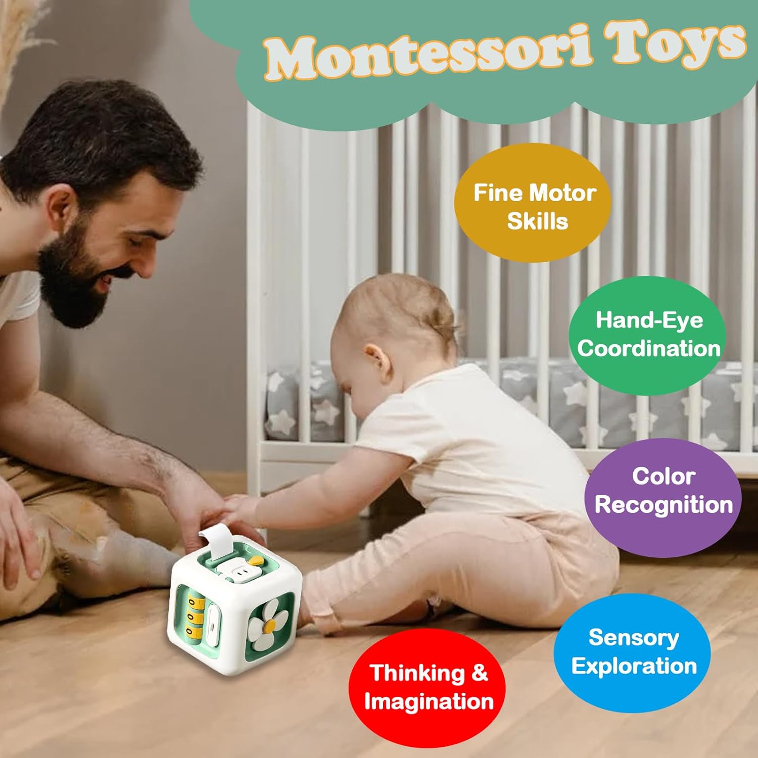 [Early Development Training]: This toddler toy for 12-24 months contains a variety of play modules that provide a range of simulated activity elements. Through grasping, pulling, spinning and pressing, the cube toys help babies develop fine motor skills, improve sensory exploration, enhance color cognition and enjoy imitative fun.