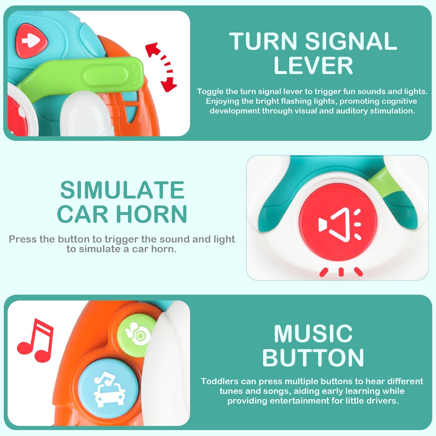 [Interactive Features]: The steering wheel toy is packed with interactive features. It has buttons that play music, sound effects, and car engine noises. Your baby can press buttons to enhance their play experience and engage their senses while enjoying bright flashes lights that promote cognitive development through visual and auditory stimulation.