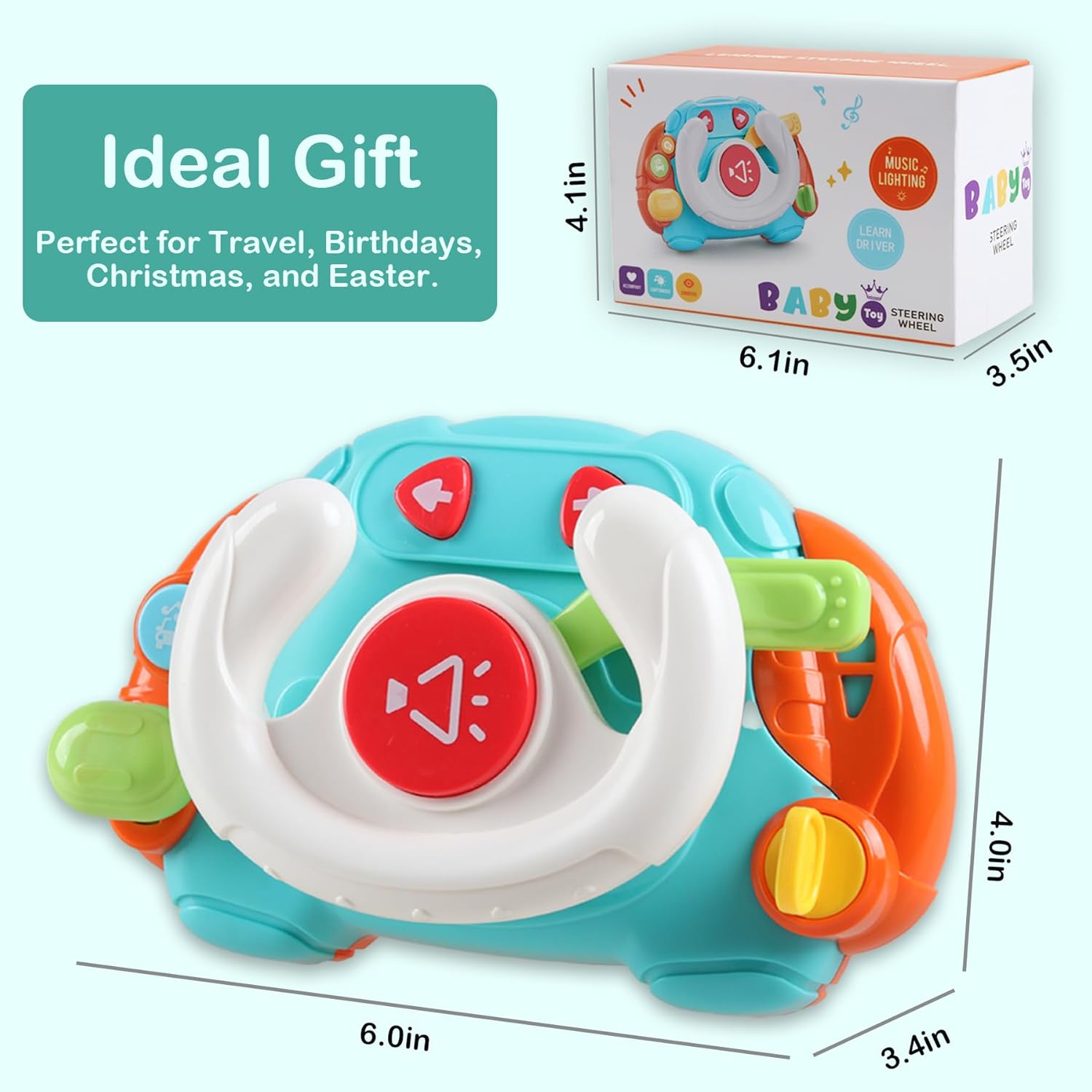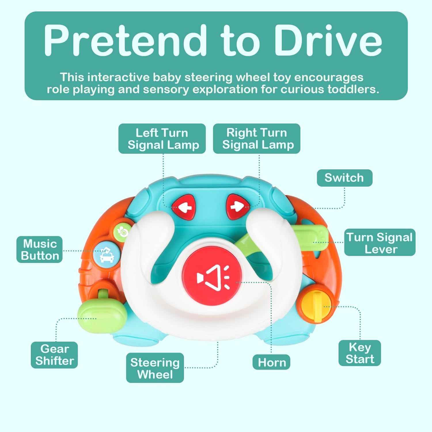 [Educational Fun]: This baby steering wheel toy features educational shapes and music buttons that play fun sounds and lights to aid in early learning while entertaining little drivers. It introduces your toddler to the concepts of driving, directions, and hand-eye coordination. They can learn about turning left and right, honking the horn, and even shifting gears.