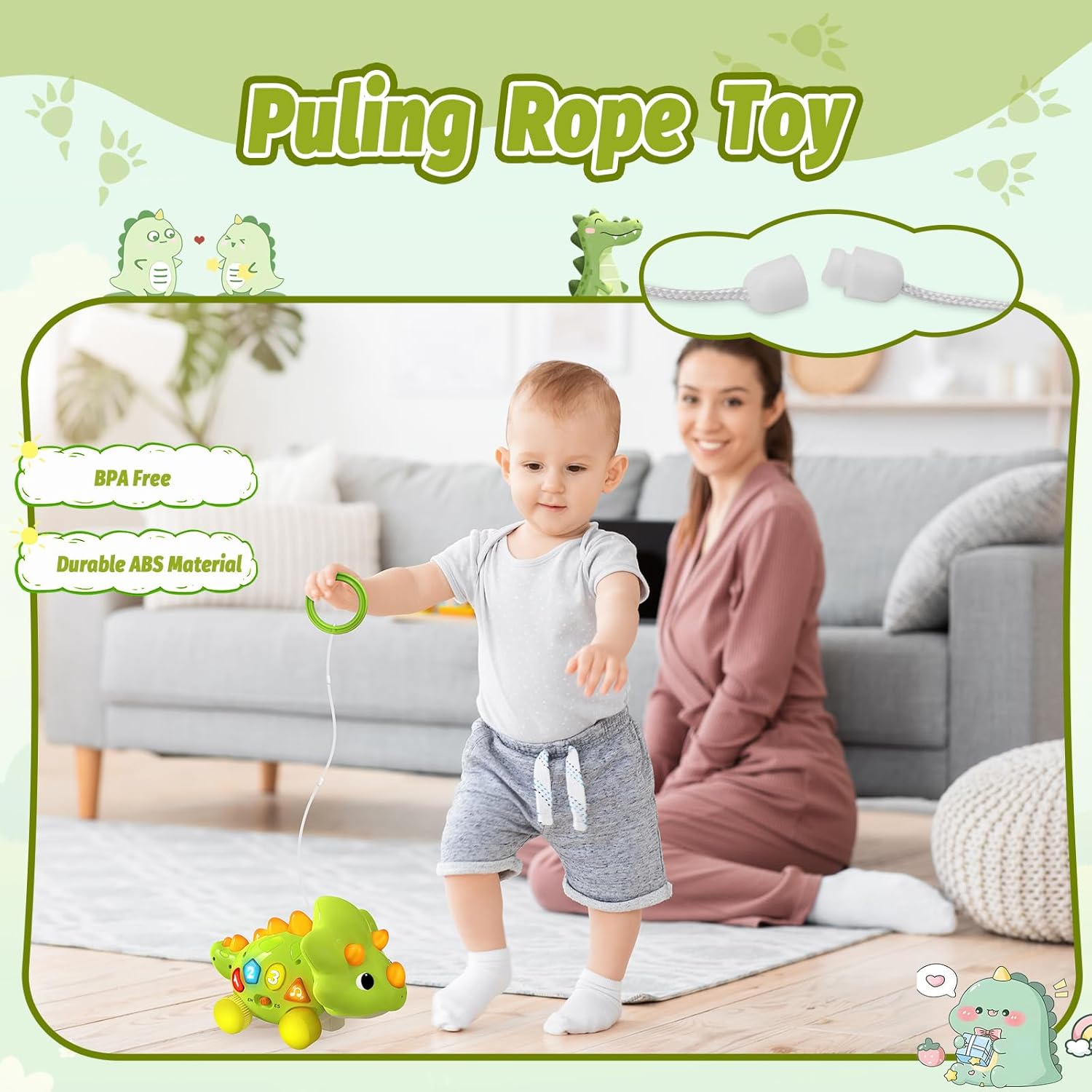 【Fun Musical Walking Baby Toy】: Press the music button to play 9 different lullabies, along with ABC songs for early language learning, all accompanied by glowing LED light, perfect for nighttime interaction with your little one, Toddlers who start to walk or run love pulling along the cute dinosaur around indoor outdoor. Equipped with multiple ropes, the length can be adjusted according to your child’s height.