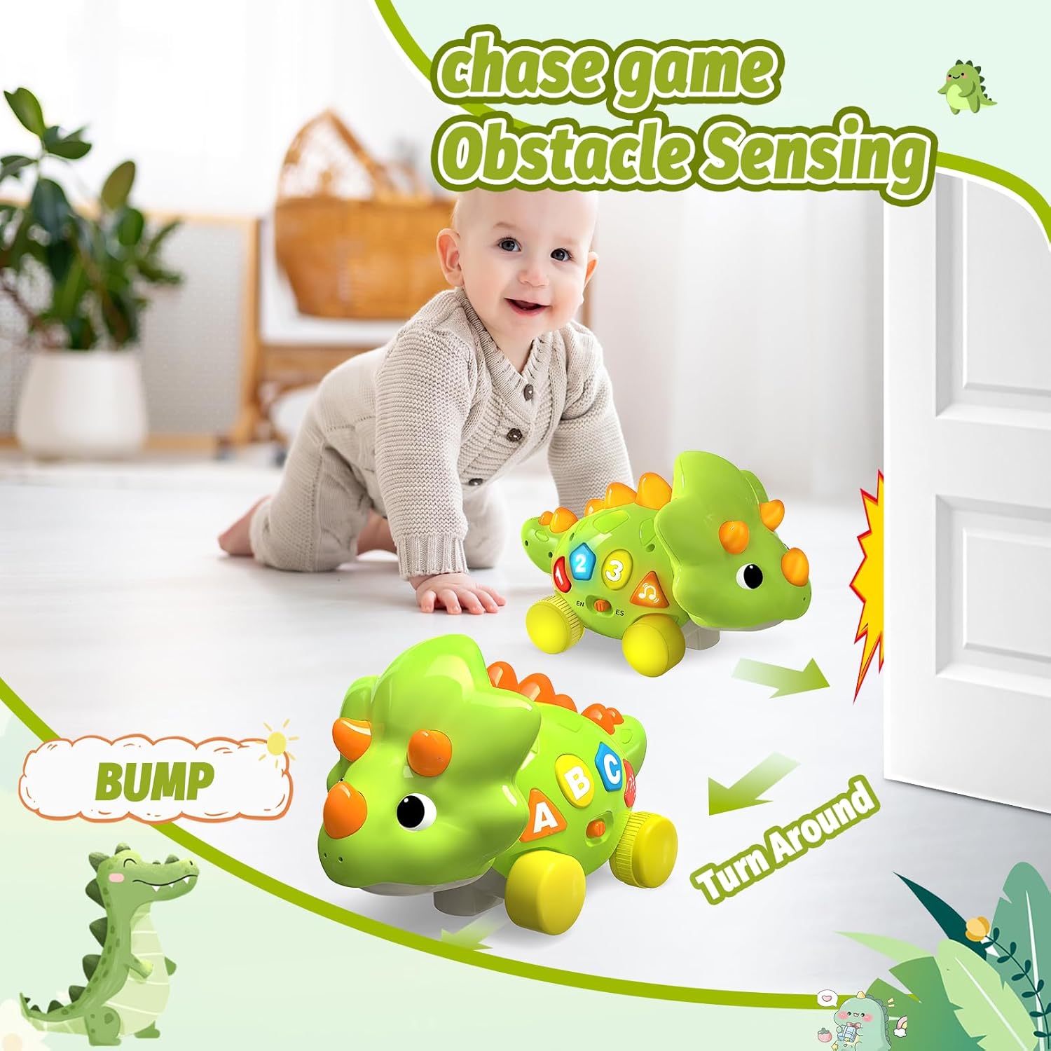 【Surprise Design & Pecfect Crawling Companion】: Turn on the toy,the Dinosaur shaking its tail while playing cheerful music and lighting up with bright LED lights, the baby will be attracted quickly,the adorable movements and sounds encourage your baby to crawl and explore. Advanced sensor systems can detect and avoid obstacles to crawl long distances, making it perfect for babies developing gross motor skills and helping maintain balance while having fun.