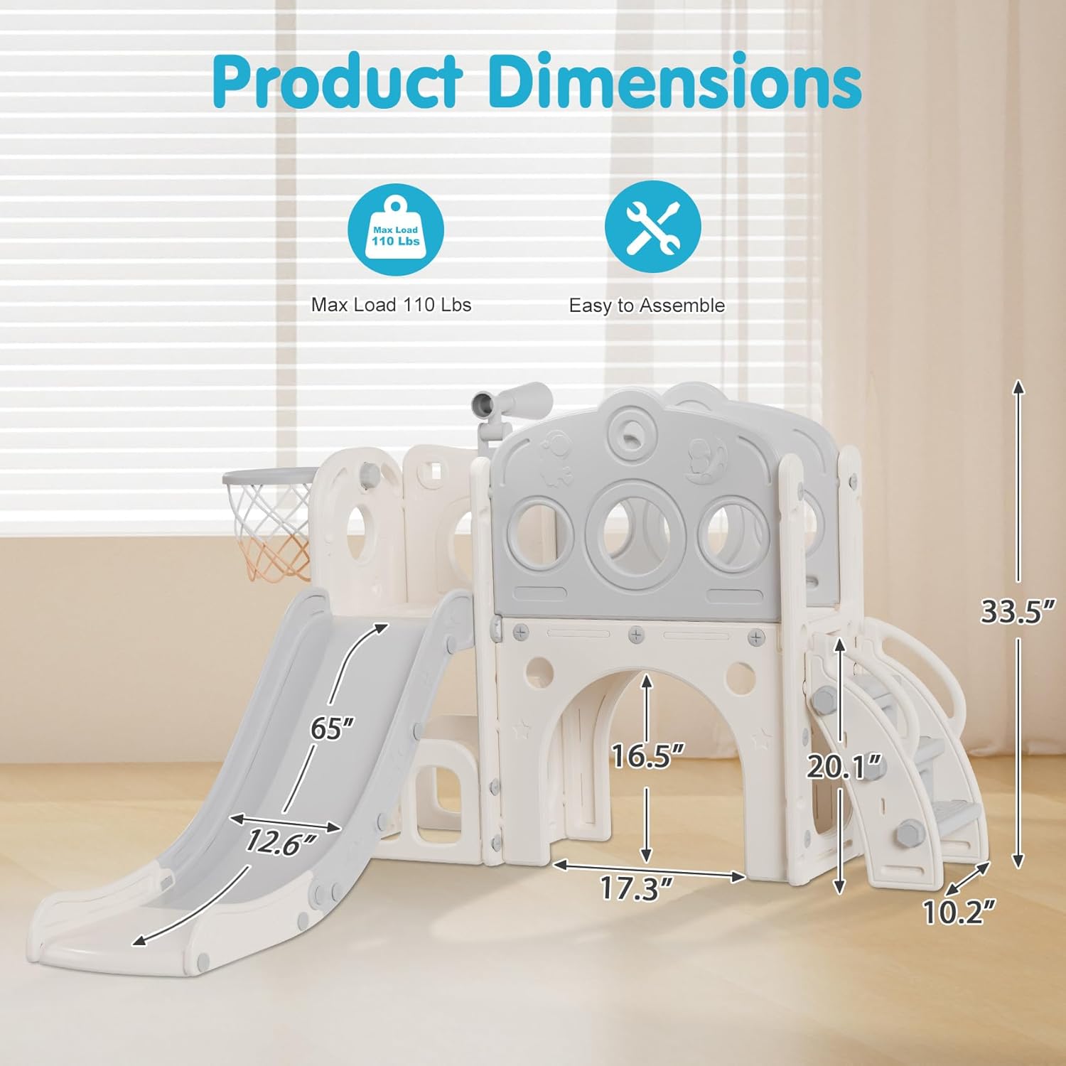 8 in 1 Versatile Playset: Hours of endless fun are to be discovered in our versatile set that’s more than just a slide. It’s a complete playground, a climber, tunnel, basketball hoop, and even a telescope, all in one. The clever design includes storage space for basketballs or other toys, making this foldable and freestanding slide a tidy addition to any child’s playroom or backyard