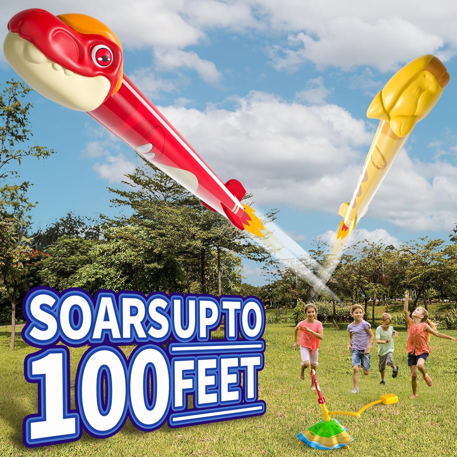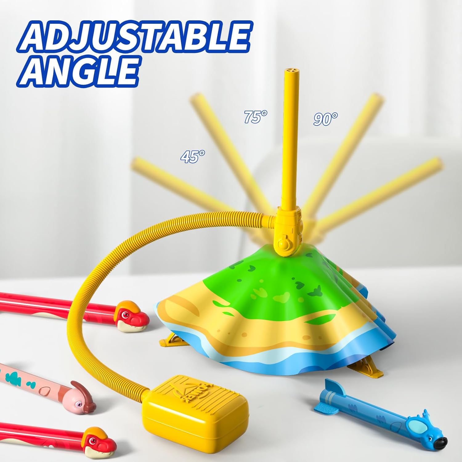 【EXQUISITE OUTDOOR DINOSAUR ROCKET LAUNCHER TOY FOR KIDS】This kids awesome outdoor toys includes 4 foam dino rockets and adjustable launchers and a durable footpad! Adjustable angle launcher allows kids to launch the rocket at different angles, which can make the dinosaur rocket fly higher or farther, more fun!