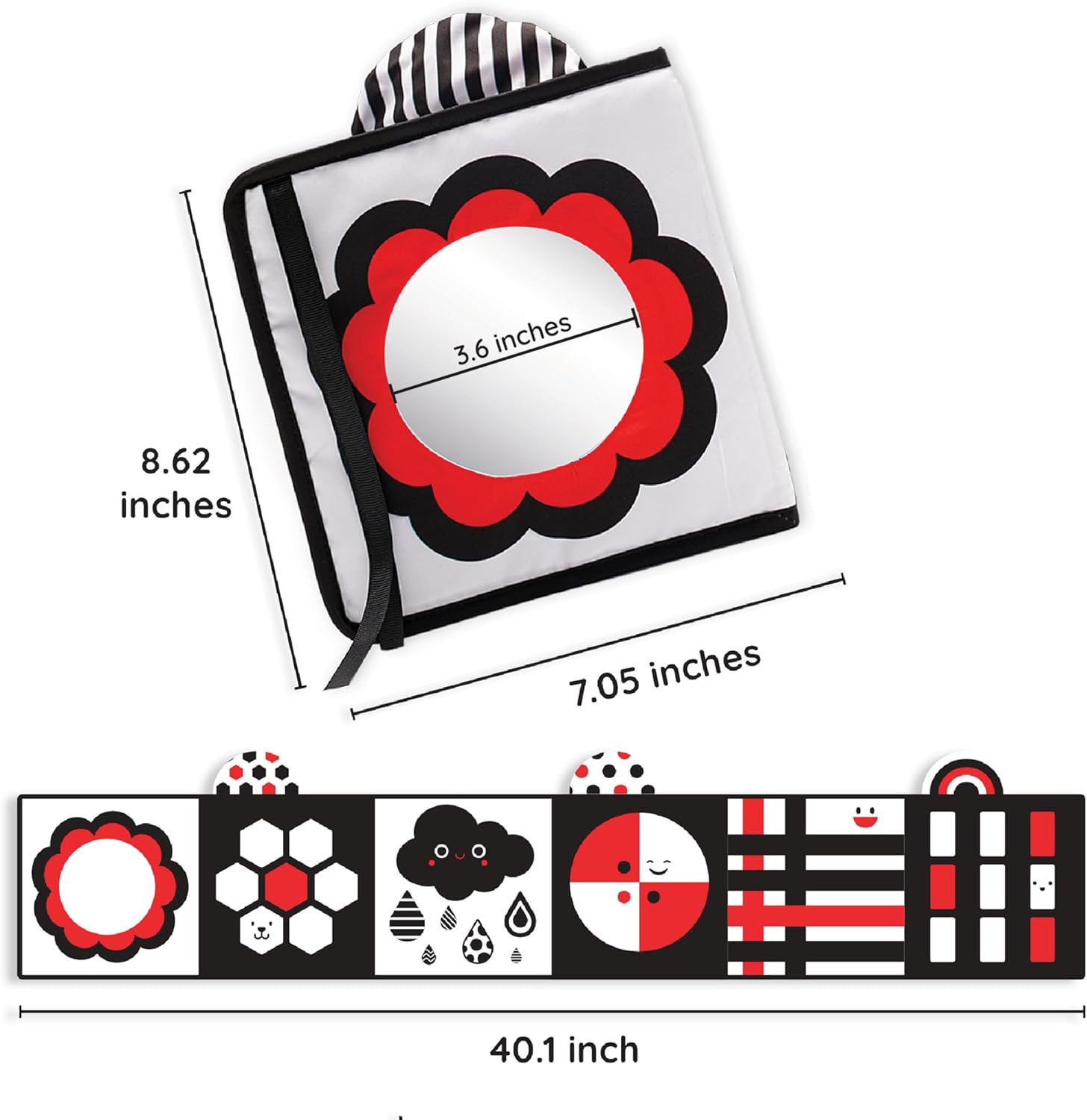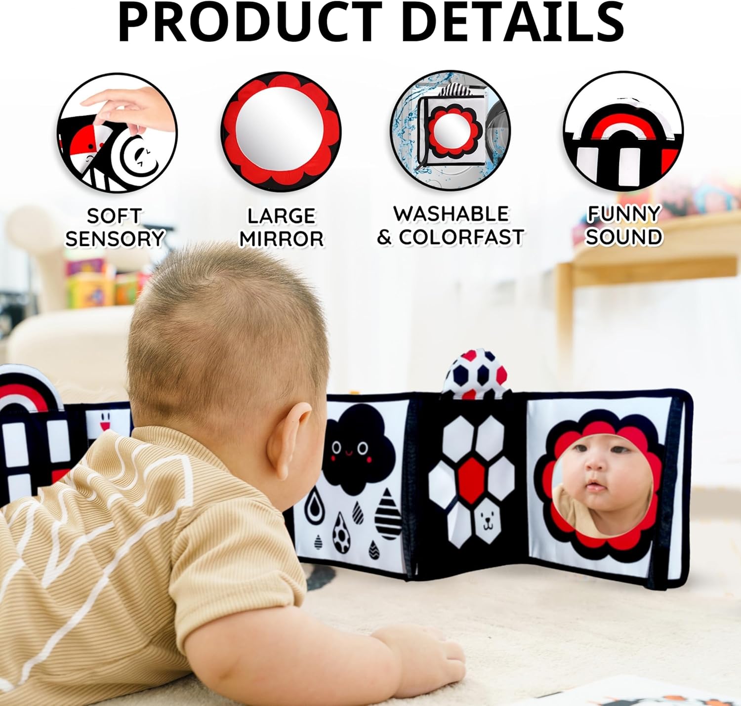✅ SAFETY & CLEANING: Our black and white soft book, essential for newborns, is crafted from non-toxic, safe materials with firm stitches and no sharp edges. Washable and fade-resistant, it ensures utmost safety. The baby-safe mirror detaches for easy cleaning, making wipes and washes a breeze. Ideal for 3-month-olds, it doubles as a tummy time favorite.