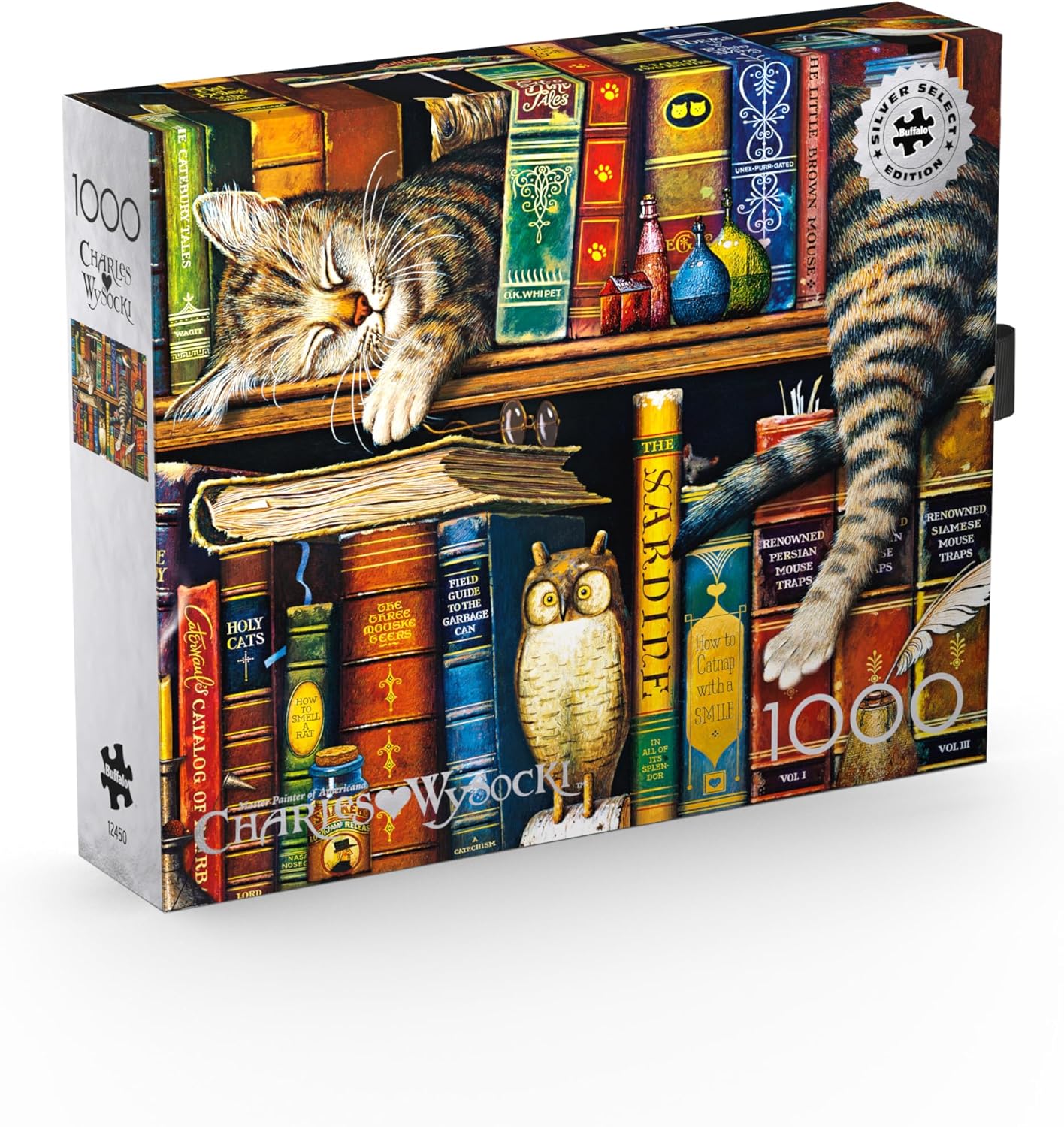 This 1000-piece jigsaw puzzle, based on the artwork of famed folk artist Charles Wysocki, is titled Frederick the Literate. A curious little cat is nestled within his favorite books. Frederick has already finished some of his favorite classics. What book will he be reading next- A Tale of Two Kitties, or The Three Mousketeers? Explore some of Frederick’s other favorite books in this whimsical Charles Wysocki puzzle. For more than 40 years Charles Wysocki enjoyed his love affair with life and Americana, and through his imaginative and colorful artwork, touched the hearts of millions worldwide. “Chuck” felt a special kinship with puzzlers who share in the creative process by building his paintings one piece at a time. The Silver Select puzzles are curated and timeless images from The Walt Disney Company, Charles Wysocki, and more. They are packaged in a giftable box with silver foil accents, use premium recycled puzzle board, and include a full-color diagram. Every Buffalo Games jigsaw puzzle is manufactured from recycled puzzle board. A precision cutting technique guarantees that every piece will fit soundly with the company’s signature Perfect Snap™. A bonus puzzle poster is also included so that you have a handy reference of what the completed puzzle should look like while you put yours together.