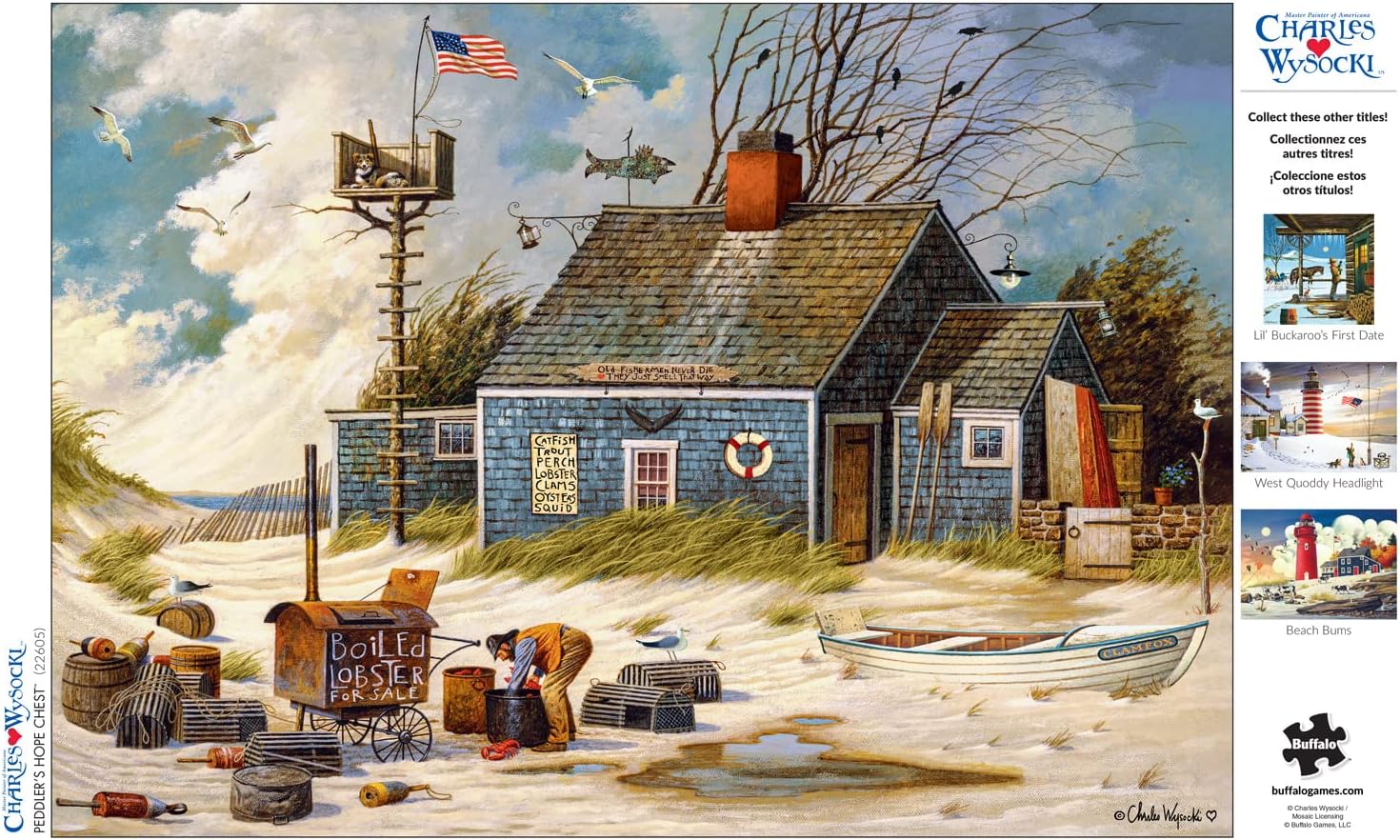 This 300-piece jigsaw puzzle titled “Peddler’s Hope Chest” is based on the artwork of Charles Wysocki. On a sandy beach, a fisherman unloads his catches of the day, and prepares to boil his lobster to sell. For more than 40 years Charles Wysocki enjoyed his love affair with life and Americana, and through his imaginative and colorful artwork, touched the hearts of millions worldwide. “Chuck” felt a special kinship with puzzlers who share in the creative process by building his paintings one piece at a time. The pieces of this puzzle are 67% larger than traditional puzzle pieces, which makes them easier to see and hold for a pleasant puzzle experience. Every Buffalo Games jigsaw puzzle is manufactured from recycled puzzle board. A precision cutting technique guarantees that every piece will fit soundly with the company’s signature Perfect Snap™. A bonus puzzle poster is also included so that you have a handy reference of what the completed puzzle should look like while you put yours together.