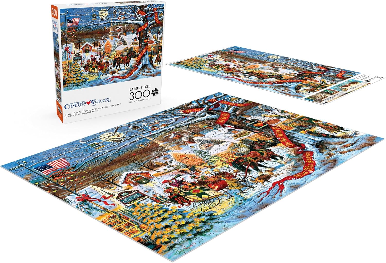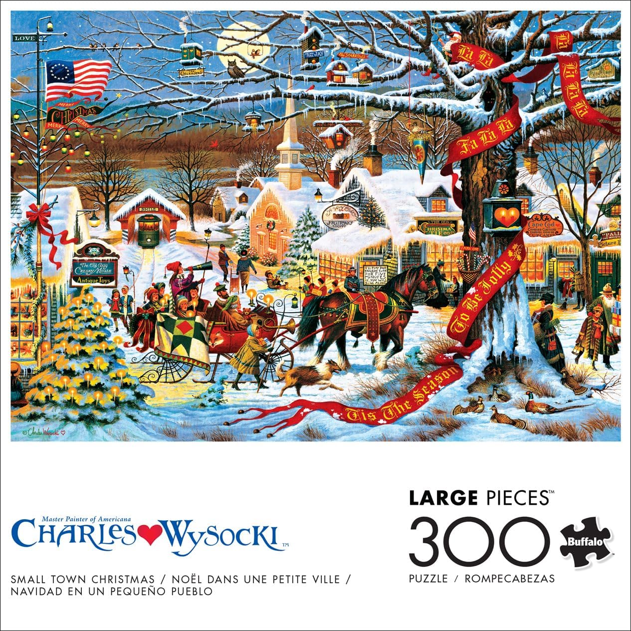 This 300-piece jigsaw puzzle titled “Small Town Christmas” by Charles Wysocki highlights all of the joys of the holiday season in one small town. It is an extraordinary example of the incredible detail and artistry of the famed master painter. For more than 40 years Charles Wysocki enjoyed his love affair with life and Americana, and through his imaginative and colorful artwork, touched the hearts of millions worldwide. “Chuck” felt a special kinship with puzzlers who share in the creative process by building his paintings one piece at a time. The pieces of this puzzle are 67% larger than traditional puzzle pieces, which makes them easier to see and hold for a pleasant puzzle experience. Every Buffalo Games jigsaw puzzle is manufactured from recycled puzzle board. A precision cutting technique guarantees that every piece will fit soundly with the company’s signature Perfect Snap™. A bonus puzzle poster is also included so that you have a handy reference of what the completed puzzle should look like while you put yours together.