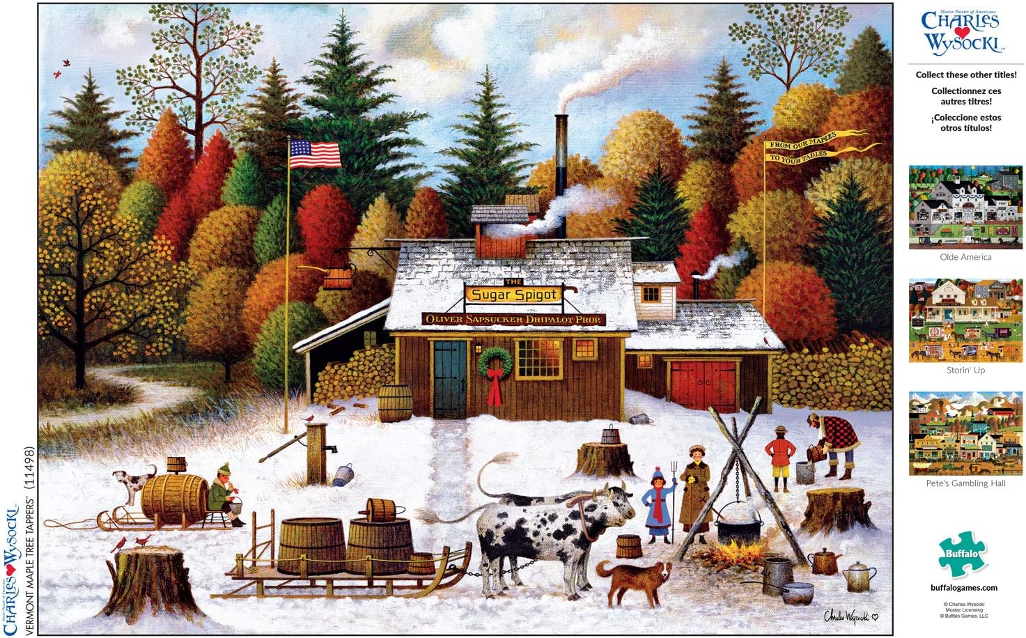 This 1,000-piece jigsaw puzzle titled Vermont Maple Tree Tappers by artist Charles Wysocki depicts a fall day in the Vermont wilderness where the sun shines on the warm on the trees whose leaves are the bright reds, oranges, and yellows typical of fall. The grass and roof are covered in a contrasting cool white Vermont snow. In the forefront, a family and their dogs and oxen are all hard at work preparing, and tasting, the freshly tapped maple syrup and tending to a fire in front of their charming log cabin style storefront featuring a festive holiday wreath on the door. They proudly fly an American flag in this holiday depiction of Americana. This puzzle is part of the Americana collection by Buffalo Games. For more than 40 years Charles Wysocki enjoyed his love affair with life and Americana, and through his imaginative and colorful artwork, touched the hearts of millions worldwide. “Chuck” felt a special kinship with puzzlers who share in the creative process by building his paintings one piece at a time. Every Buffalo Games jigsaw puzzle is manufactured from recycled puzzle board. A precision cutting technique guarantees that every piece will fit soundly with the company’s signature Perfect Snap™. A bonus puzzle poster is also included so that you have a handy reference of what the completed puzzle should look like while you put yours together.