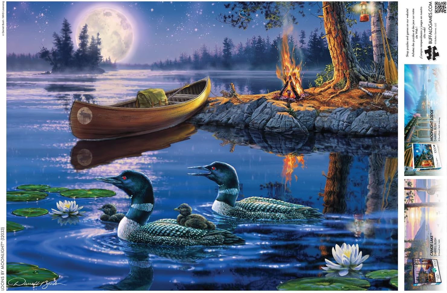 Loons by Moonlight is a 1000-piece jigsaw puzzle from the Darrell Bush collection by Buffalo Games. Gather around the campfire, under the beautiful full moon, and piece together this peaceful scene of Loons and their babies swimming through the lilypads. Along with being named among America’s 12 most popular artists by four different national art publications, Darrell Bush has won two national stamp competitions for the state of Minnesota and Idaho. Darrell Bush art has been featured in numerous Boy Scouts of America fund-raising programs and conservation organizations including The National Fish and Wildlife Federation, Ducks Unlimited, Pheasants Forever and The National Wild Turkey Federation. The publications Wildlife Art, U.S. Art, Inform Art, Midwest Today, Minnesota Waterfowler, and Gander Mountain have all featured Darrell Bush’s art. He has also worked with National Geographic and the Smithsonian Institution. Every Buffalo Games jigsaw puzzle is manufactured from recycled puzzle board. A precision cutting technique guarantees that every piece will fit soundly with the company’s signature Perfect Snap™. A bonus puzzle poster is also included so that you have a handy reference of what the completed puzzle should look like while you put yours together.