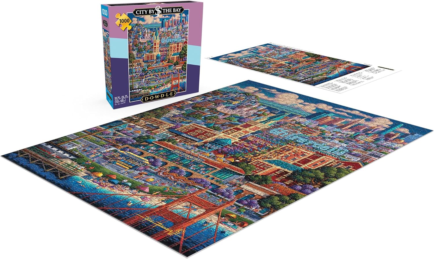 This 1000-piece jigsaw puzzle titled “City by the Bay” is based on the artwork of Eric Dowdle. This image showcases the beautiful skyline of San Francisco, California. Catch glimpses of some San Fran staples, like the Golden Gate bridge, the Ghirardelli factory, and iconic cable cars on the street. Eric Dowdle was born the tenth of 12 children to a family of storytellers. He has traveled the world to discover fascinating people and places to include in his art. Each Dowdle puzzle has a colorful story to tell. Every Buffalo Games jigsaw puzzle is manufactured from recycled puzzle board. A precision cutting technique guarantees that every piece will fit soundly with the company’s signature Perfect Snap™. A bonus puzzle poster is also included so that you have a handy reference of what the completed puzzle should look like while you put yours together.