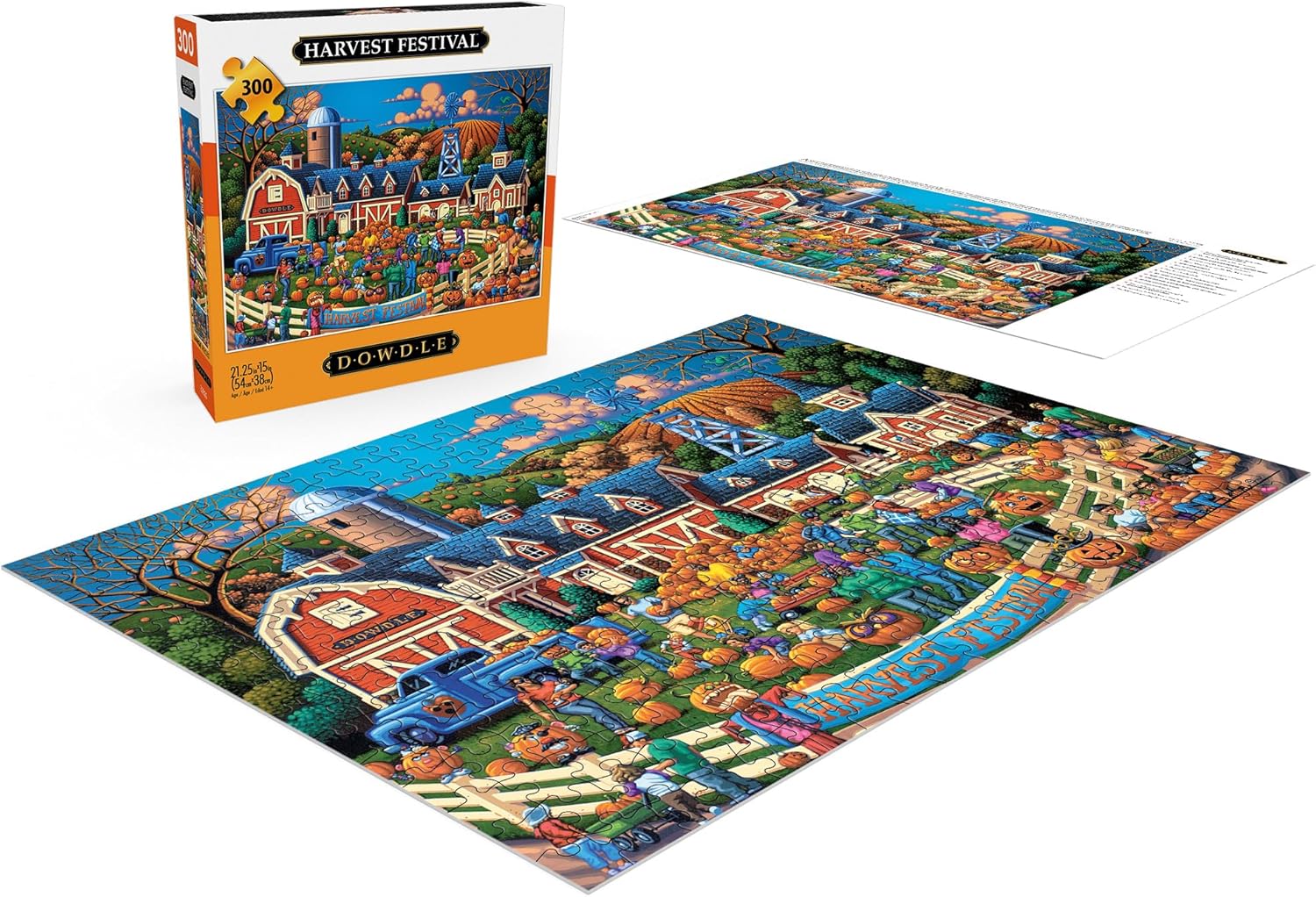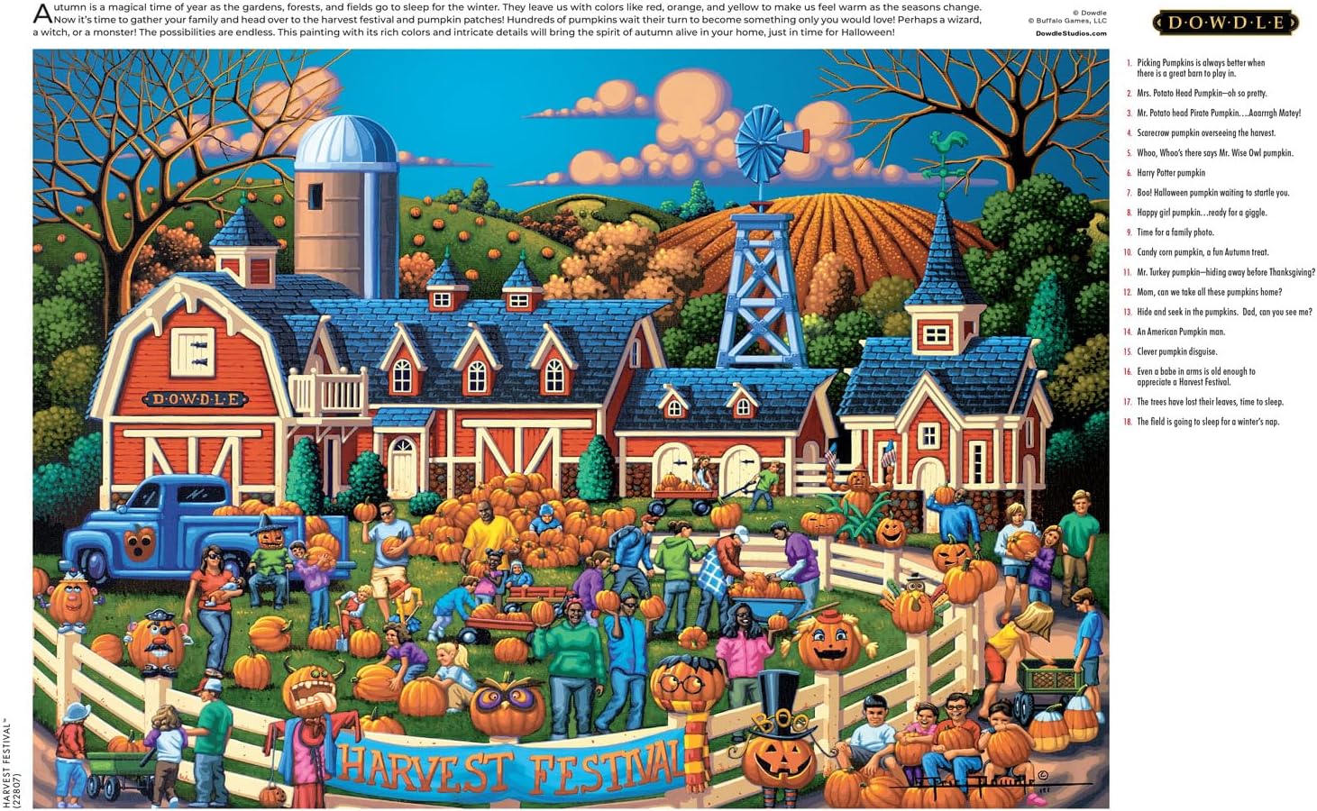 This 300-piece jigsaw puzzle titled “Harvest Festival” is based on the artwork of Eric Dowdle. This image features a lively autumn scene of families gathering at a farm to do some pumpkin picking at the Harvest Festival! Eric Dowdle was born the tenth of 12 children to a family of storytellers. He has traveled the world to discover fascinating people and places to include in his art. Each Dowdle puzzle has a colorful story to tell. Every Buffalo Games jigsaw puzzle is manufactured from recycled puzzle board. A precision cutting technique guarantees that every piece will fit soundly with the company’s signature Perfect Snap™. A bonus puzzle poster is also included so that you have a handy reference of what the completed puzzle should look like while you put yours together.