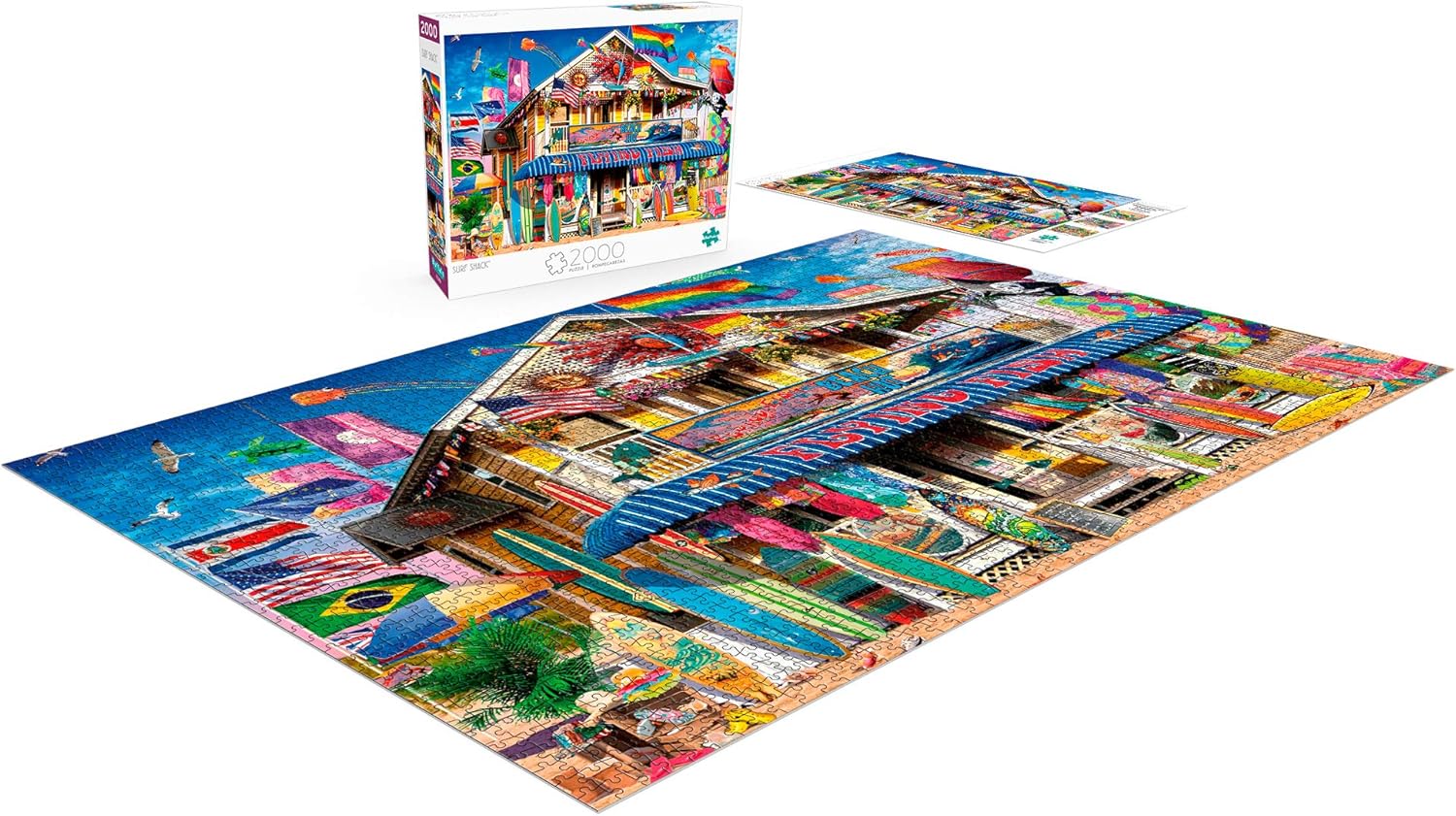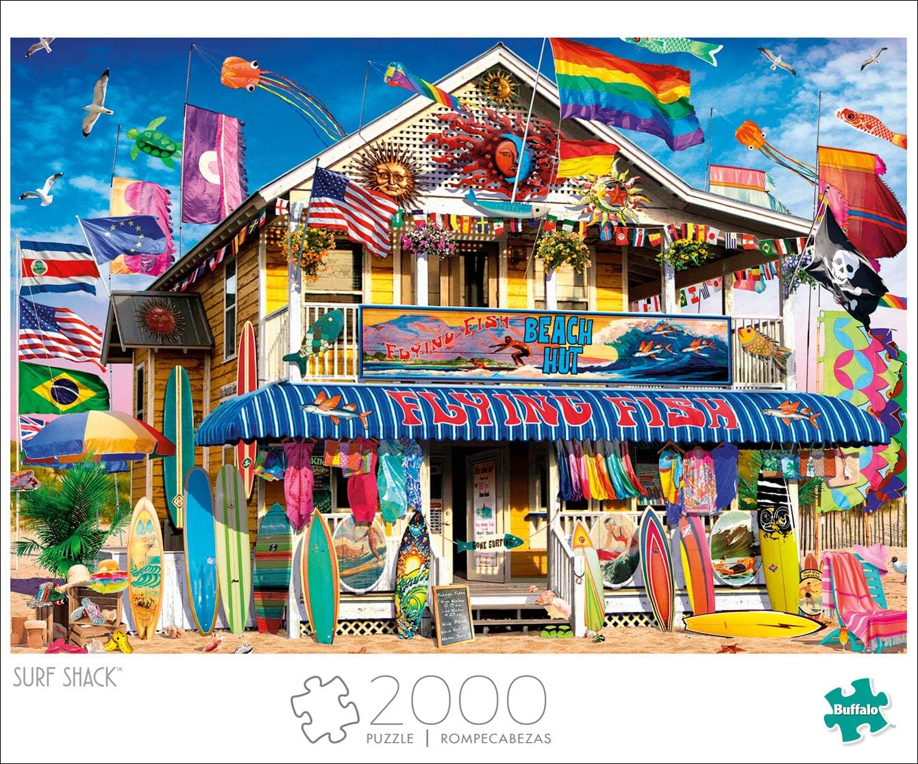 This 2,000 piece puzzle titled Surf Shack is from the Art of Play collection by Buffalo Games. This fun and colorful surf shack has everything you’d need for a day at the beach. From flags of various countries, to decorative suns, and, of course, plenty of colorful surfboards to choose from! Buffalo Games jigsaw puzzle is manufactured from recycled puzzle board. s signature Perfect Snap™. A bonus puzzle poster is also included so that you have a handy reference of what the completed puzzle should look like while you put yours together.