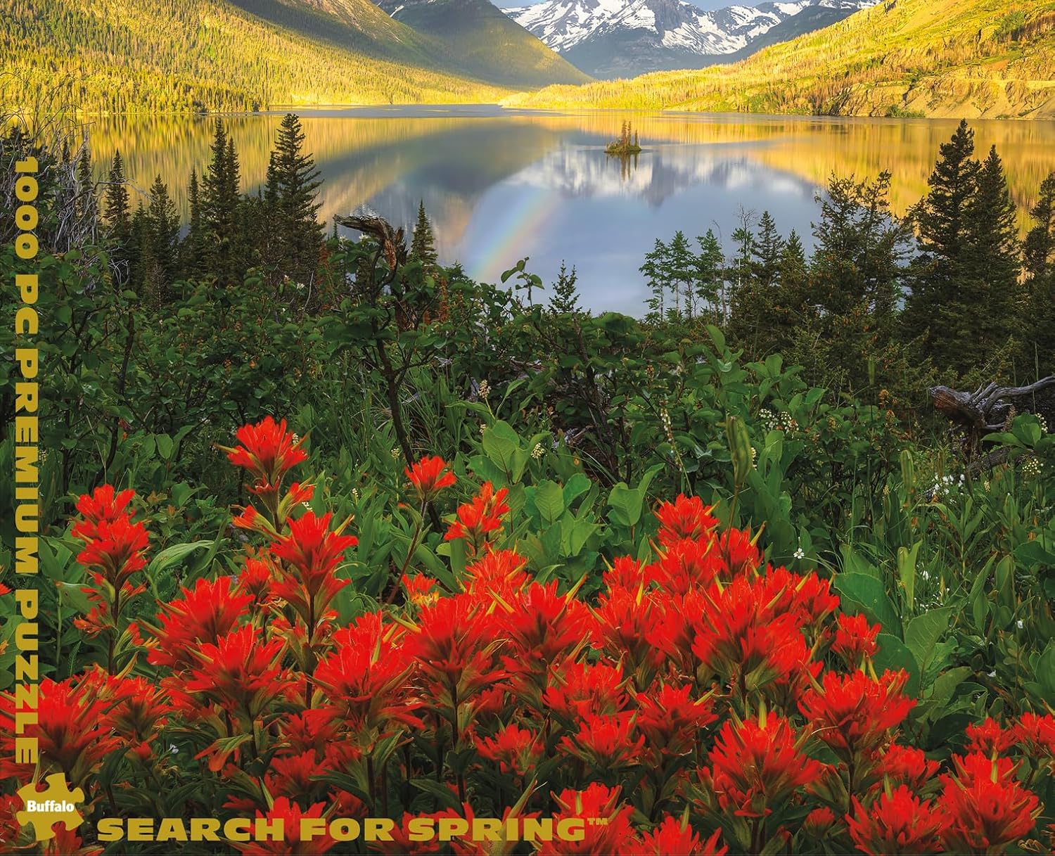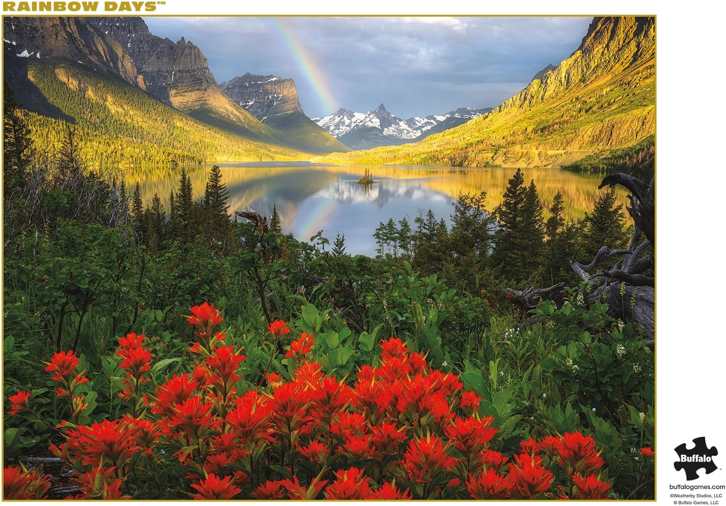 Enjoy piecing together this 1000-piece premium jigsaw puzzle from the Buffalo Games Gold Collection titled Rainbow Days. This image is a beautiful view of the Glacier Mountains in Montana from the flowery ground below them. Every Buffalo Games jigsaw puzzle is manufactured from recycled puzzle board. A precision cutting technique guarantees that every piece will fit soundly with the company’s signature Perfect Snap™. A bonus puzzle poster is also included so that you have a handy reference of what the completed puzzle should look like while you put yours together.