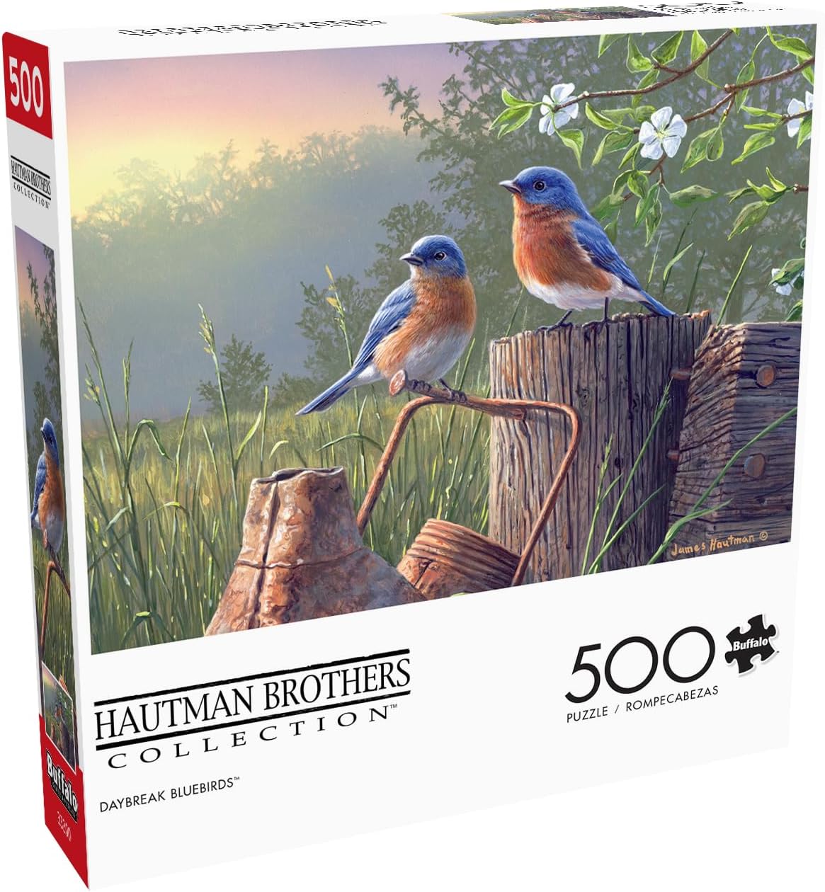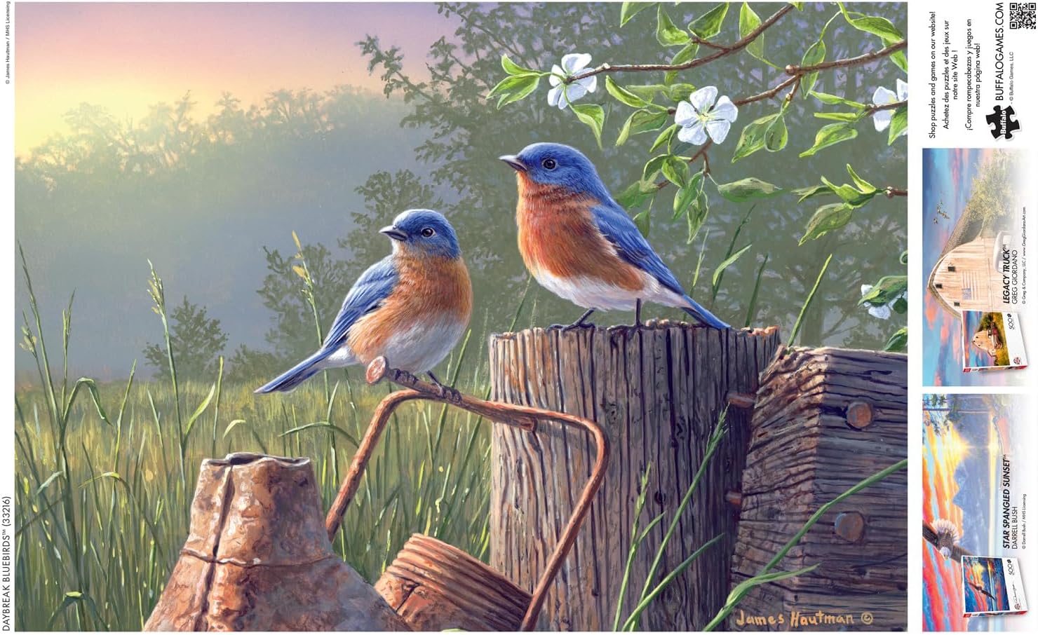 Daybreak Bluebirds is a 500-piece jigsaw puzzle by Buffalo Games and part of the Hautman Brothers Collection. Two beautiful blue birds sit atop a log and some old tools in the middle of a grassy field at sunrise. This puzzle offers a satisfying challenge for puzzle enthusiasts and nature lovers, bringing the enchantment of a tranquil morning into your home. The Hautman Collection features fine art inspired by nature! The Hautman Brothers have established themselves as America’s foremost family of wildlife artists. Hautman Brothers art has been featured on over 41 state and federal stamps and displayed in both the Smithsonian Institute and the Oval Office. Every Buffalo Games jigsaw puzzle is manufactured from recycled puzzle board. A precision cutting technique guarantees that every piece will fit soundly with the company’s signature Perfect Snap™. A bonus puzzle poster is also included so that you have a handy reference of what the completed puzzle should look like while you put yours together.