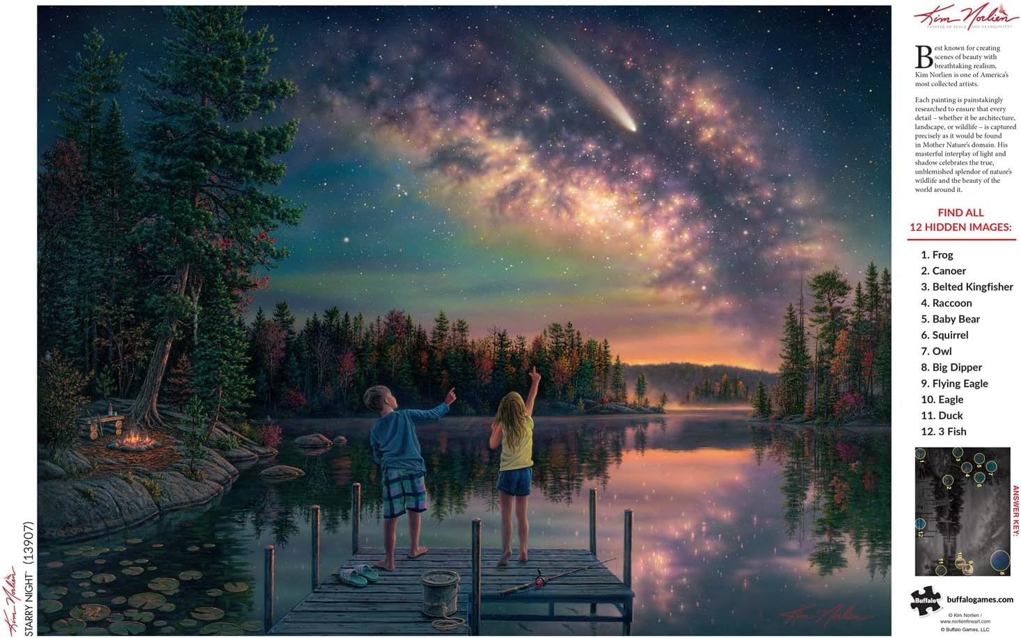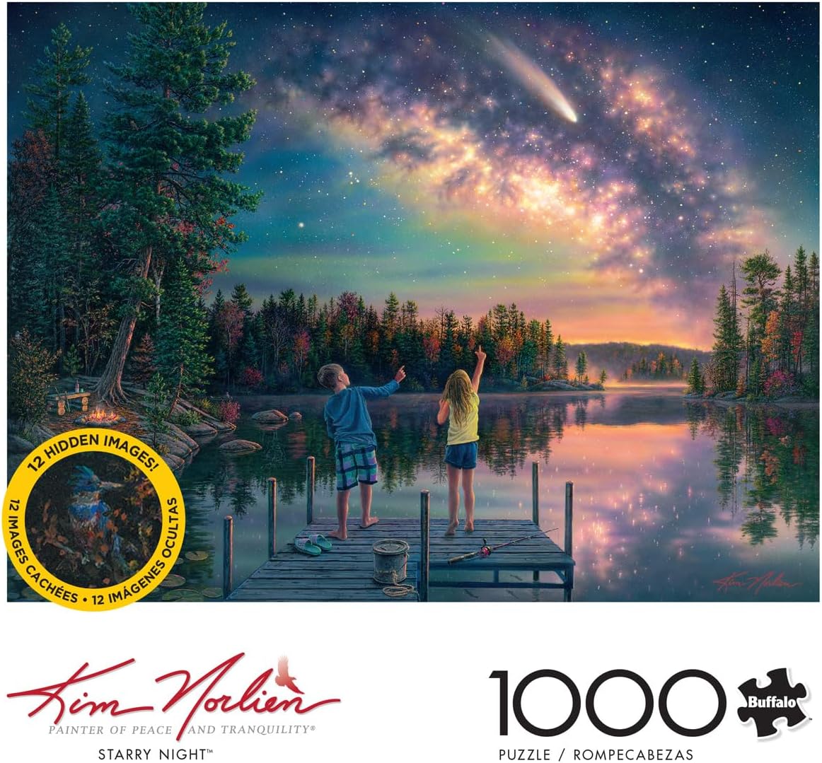 Starry Night is a 1000-piece jigsaw puzzle based on the artwork of renowned painter Kim Norlien. Embark on a stargazing adventure with this captivating puzzle as two curious kids stand on a dock by the lake, encircled by majestic trees, pointing and marveling at the twinkling stars in the magnificent night sky. As an added bonus, if you’re up for a fun challenge, look for 12 hidden images as you piece this puzzle together. Best known for creating scenes of beauty with breathtaking realism, Kim Norlien is one of America’s most collected artists. He has exhibited his art in shows throughout the United States and his museum-quality originals are highly regarded by collectors. His masterful interplay of light and shadow celebrates the true, unblemished splendor of nature’s wildlife and the beauty of the world around them. Each painting is painstakingly researched to ensure that every detail – whether it be architecture, landscape or wildlife – is captured precisely as it would be found in nature. Every Buffalo Games jigsaw puzzle is manufactured from recycled puzzle board. A precision cutting technique guarantees that every piece will fit soundly with the company’s signature Perfect Snap™. A bonus puzzle poster is also included so that you have a handy reference of what the completed puzzle should look like while you put yours together.