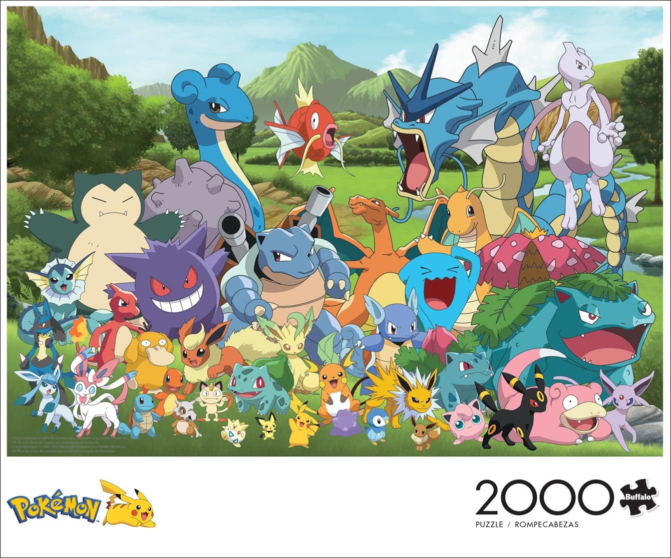 This 2000-piece Pokémon jigsaw puzzle features dozens of popular Pokémon from all seven regions! Pikachu, Eevee, Snorlax, Mewtwo, Magikarp, and many more make an appearance in this exciting group portrait. ©2022 Pokémon. TM, ® Nintendo.
