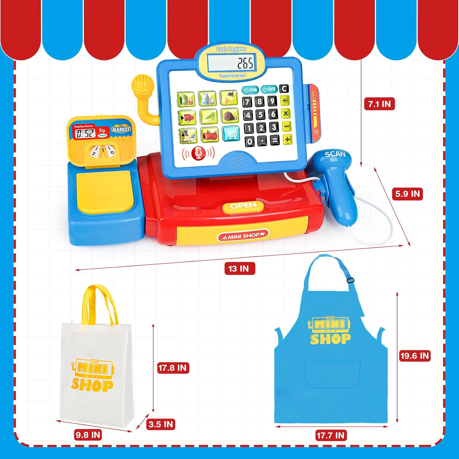 【Larger size for a better experience】 – This cash register toy measures 13*5.9*7.1 inches, offering an enlarged version compared to smaller mini cash register toys. This upgraded cash register provides a more immersive pretend play experience for kids and is suitable for a wider age range, allowing it to entertain kids for longer periods.