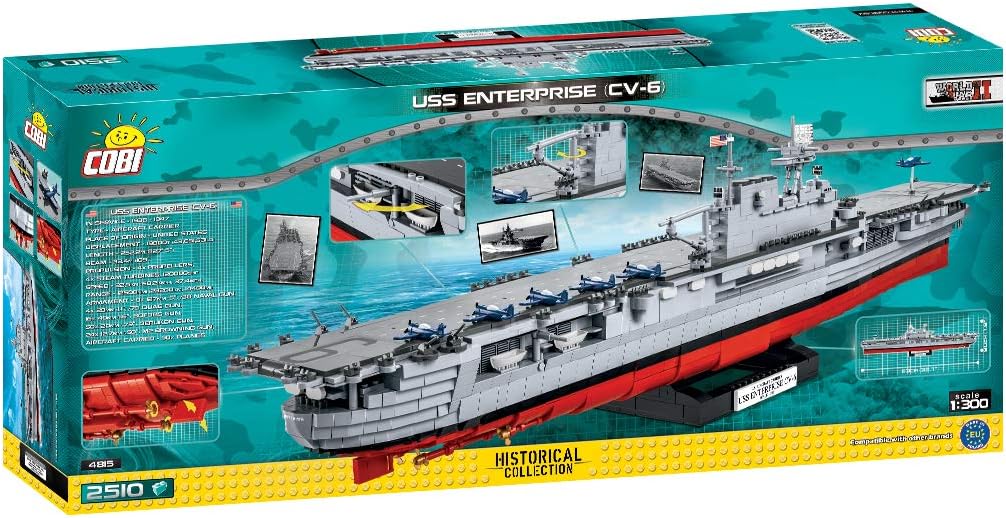 USS Enterprise is an American aircraft carrier from World War II. Its name means “entrepreneurial”, “darts” and “full of energy”. It was already the seventh ship bearing this honourable name in the US Navy. It was commonly called “Big E”. It served very actively in the Pacific throughout the war with Japan. It was honoured with 20 stars for its combat operations. The USS Enterprise was entered into service in May 1938. It was equipped with 8 universal 127 mm calibre guns. During the war, new more effective small-calibre anti-aircraft guns and large-calibre machine guns were constantly exchanged and added. The air carrier was also equipped with the most modern air surveillance radars, radio altimeter and rangefinder. USS Enterprise took 70 – 91 aircraft with it depending on the period. These were fighters, dive bombers and torpedo planes. Official statistics confirm that 911 enemy planes and artillery shot down. Its dive bombers and torpedo planes contributed to the sinking of 71 enemy ships and damaged another 192. The USS Enterprise operated in the Pearl Harbour area in the initial phase of the war. It covered the Hornet aircraft carrier during the first raid on Tokyo (Doolittle Rally). As a flagship, she took part in the battle for Midway, in which planes from American carriers led to the sinking of four Japanese carriers. During the battle in the Solomon Islands the Enterprise was severely damaged. After refurbishment at Pearl Harbour, it returned to warfare, supporting landing operations and taking part in bombing of Japanese targets. The USS Enterprise took part in a great battle in the Philippine Sea. An operational group with the Enterprise in its fleet, contributed to the sinking of the super battleship Musashi. On February 10, 1945 the Enterprise supported the landing and fighting on Iwo Jim. The end of the war found the Enterprise at Puget Sound Navy Yard where it was repaired after taking damage from one of the kamikaze planes. From the world of COBI comes a model of the legendary USS Enterprise aircraft carrier (CV-6). The kit has been designed in a standard 1:300 scale. The set consisting of as many as 2510 blocks will provide many hours of exciting construction and fun. Using high quality prints to reproduce the deck painting and ship’s details from the World War II period this model will really please those builders who like detail in their kits. The high quality of this kit means that the prints do not wear after time or with play from little one’s hands. The model is equipped with as many as 6 micro-block aircraft and a special transparent block, which after being attached to the undercarriage can imitate the plane taking off. The USS Enterprise aircraft (CV-6) can be displayed on the fantastic stand included in the kit. This set will add to any collection of large and small fans of Navy, history and model- making. 2510 high quality elements, nameplate, produced in the EU by a company with over 20 years of tradition, meet the safety standards for children’s products, Fully compatible with other brands of construction blocks, Printed pads do not deform and do not fade during play or under temperature,clear and intuitive instruction based on drawings and icons, moving parts, 6 miniature aircraft models, a special transparent block which, when attached to the underlay, can imitate a take-off plane.