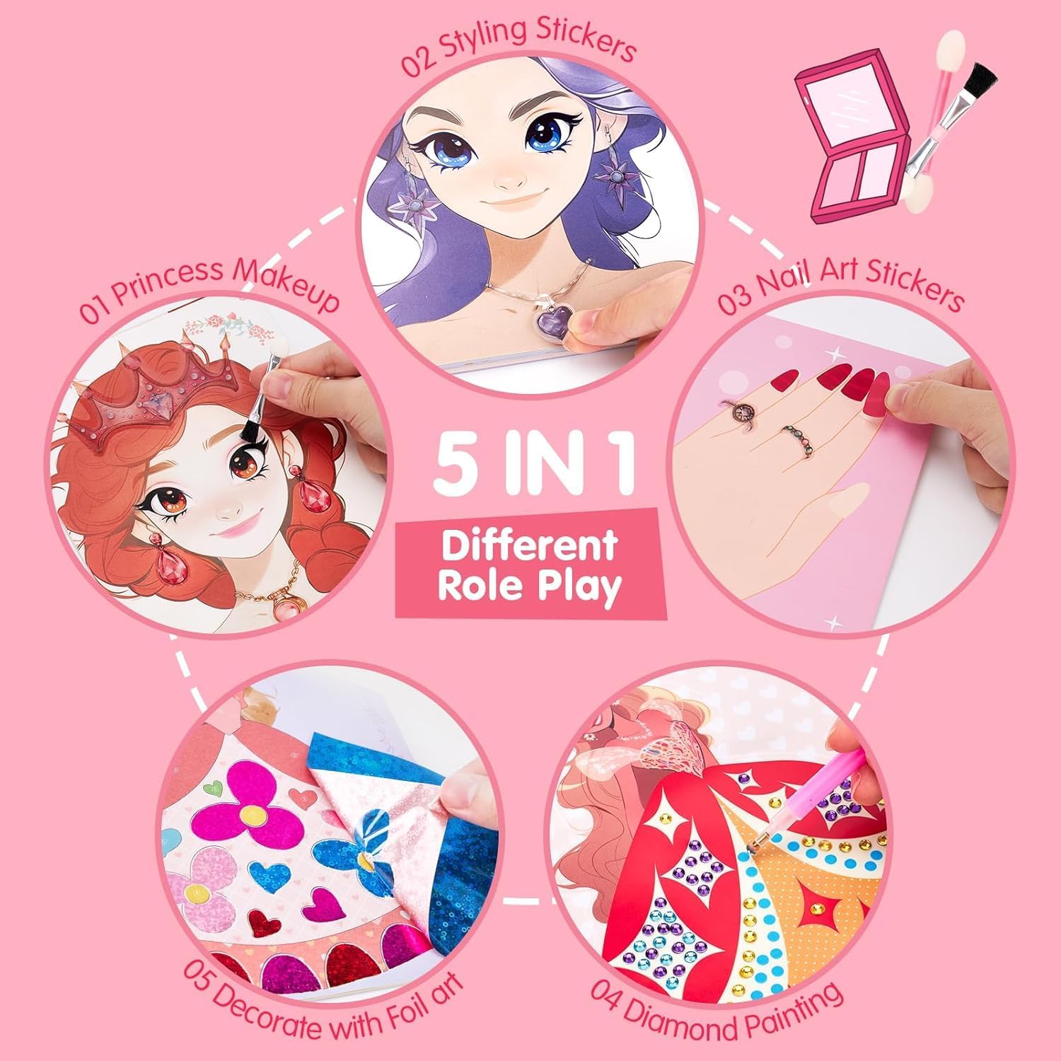 5-in-1 Princess Activity Book : Let your little girl explore five exciting roles—makeup artist, stylist, costume designer, nail technician, and fashion designer. This kit celebrates diversity with princesses of different skin tones, allowing her to create inclusive and unique looks. With vibrant eye shadows, blush, diamond painting gems, and nail art stickers, she can craft stunning outfits and glamorous makeovers. This kit sparks creativity and enhances fine motor skills, making it perfect for imaginative play