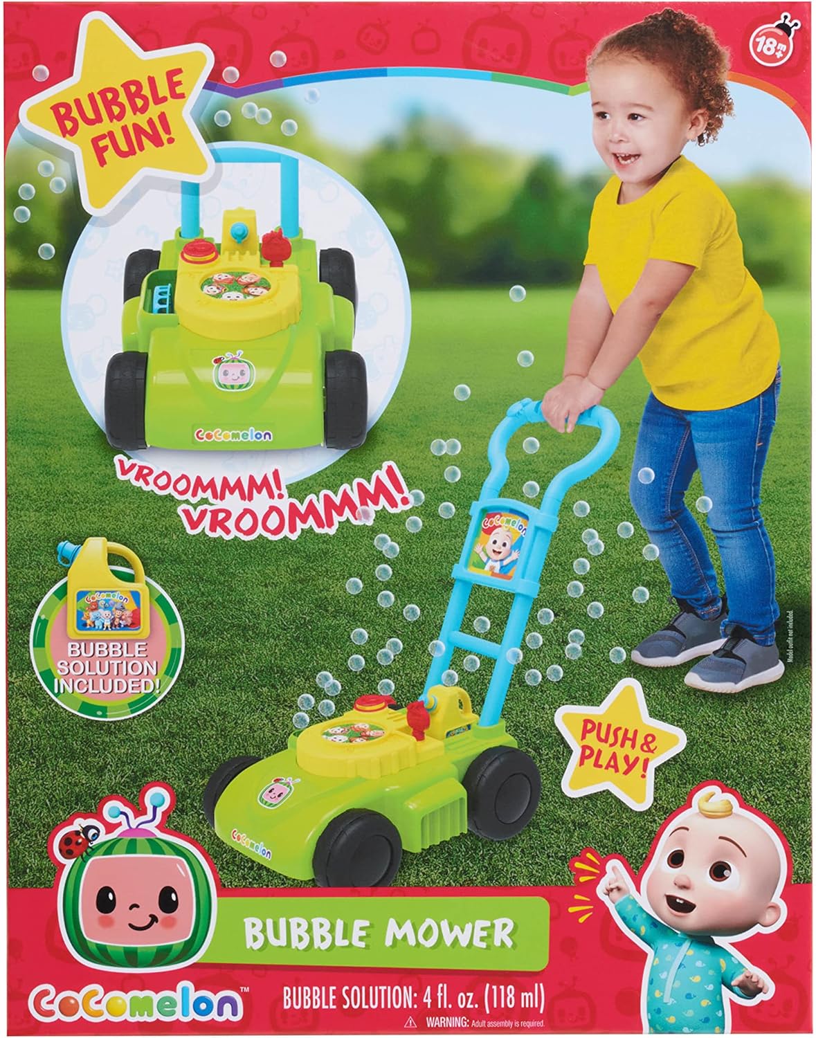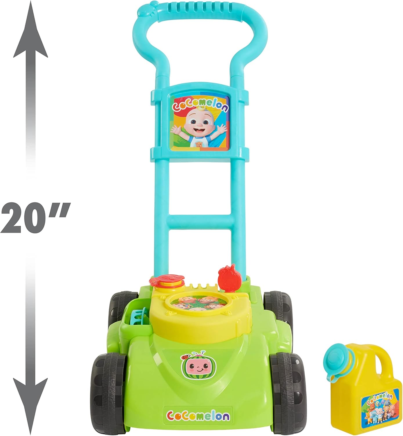 Learn and play with JJ! Motivate toddlers to be active with a CoComelon-themed lawn mower that blows sudsy bubbles and makes motor sounds while kids push it along. The colorful CoComelon Bubble Mower is lightweight and has a handle that makes it easy for little ones to push and pull. Preschoolers will love pretending to help parents with yardwork, by doing their part to “mow” the lawn. Built for imaginative, outdoor play, this kid-powered lawn mower requires no batteries and comes with a pretend gas can filled with bubble solution. Bring home the CoComelon Bubble Mower, as well as the rest of the CoComelon learning and education toys, to help make curious toddlers happy and smart! Ideal for toddlers and preschoolers ages 18 months and up.