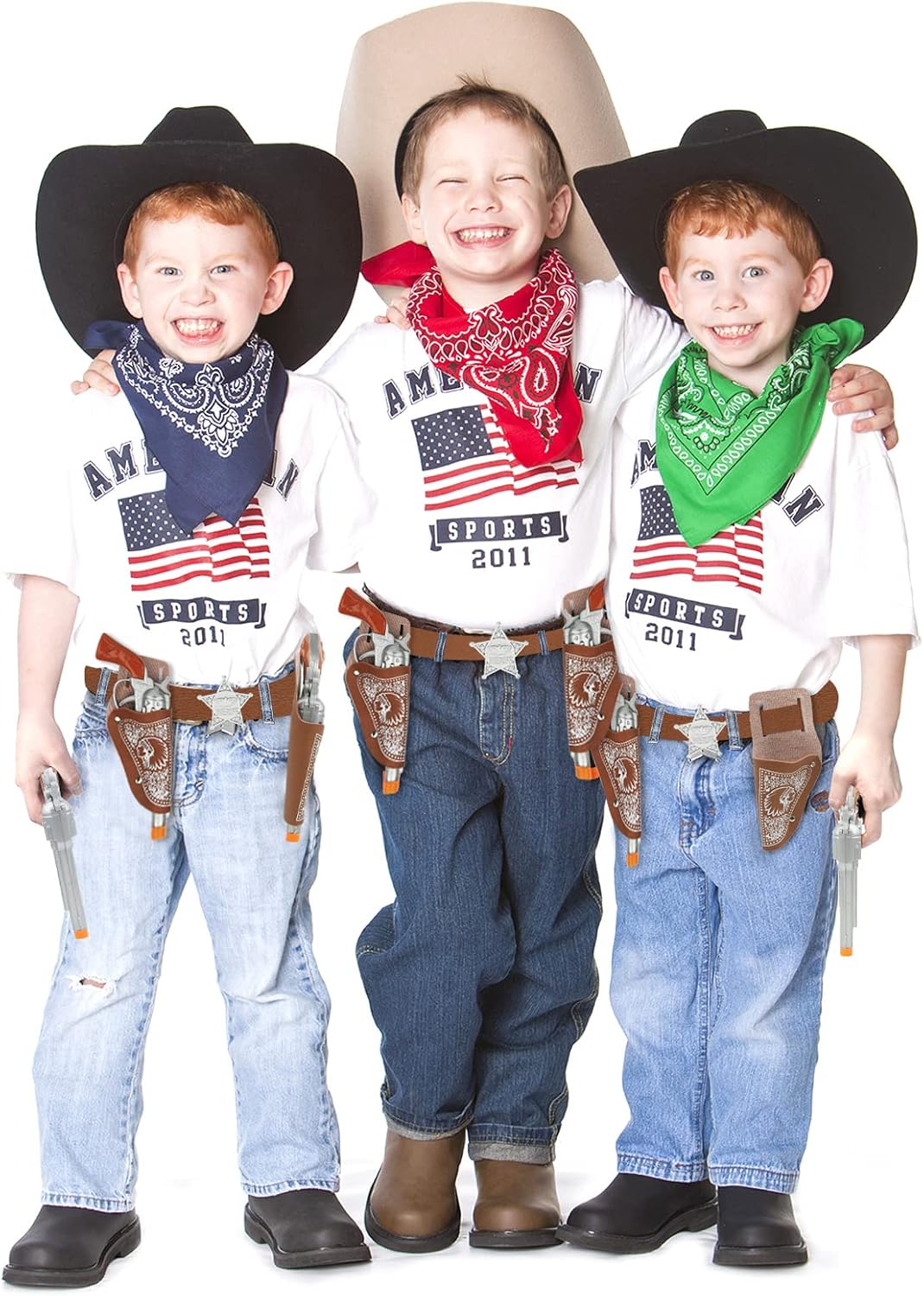 Excellent Quality: The gun belt and holsters are made of artificial leather with realistic details, durable and sturdy, it will not break and deform easily. The material is comfortable and easy to put on, just wipe with a damp cloth to clean. The toy guns and badge are made of plastic with a smooth surface and light weight, making them ideal for playing as kid’s toys.