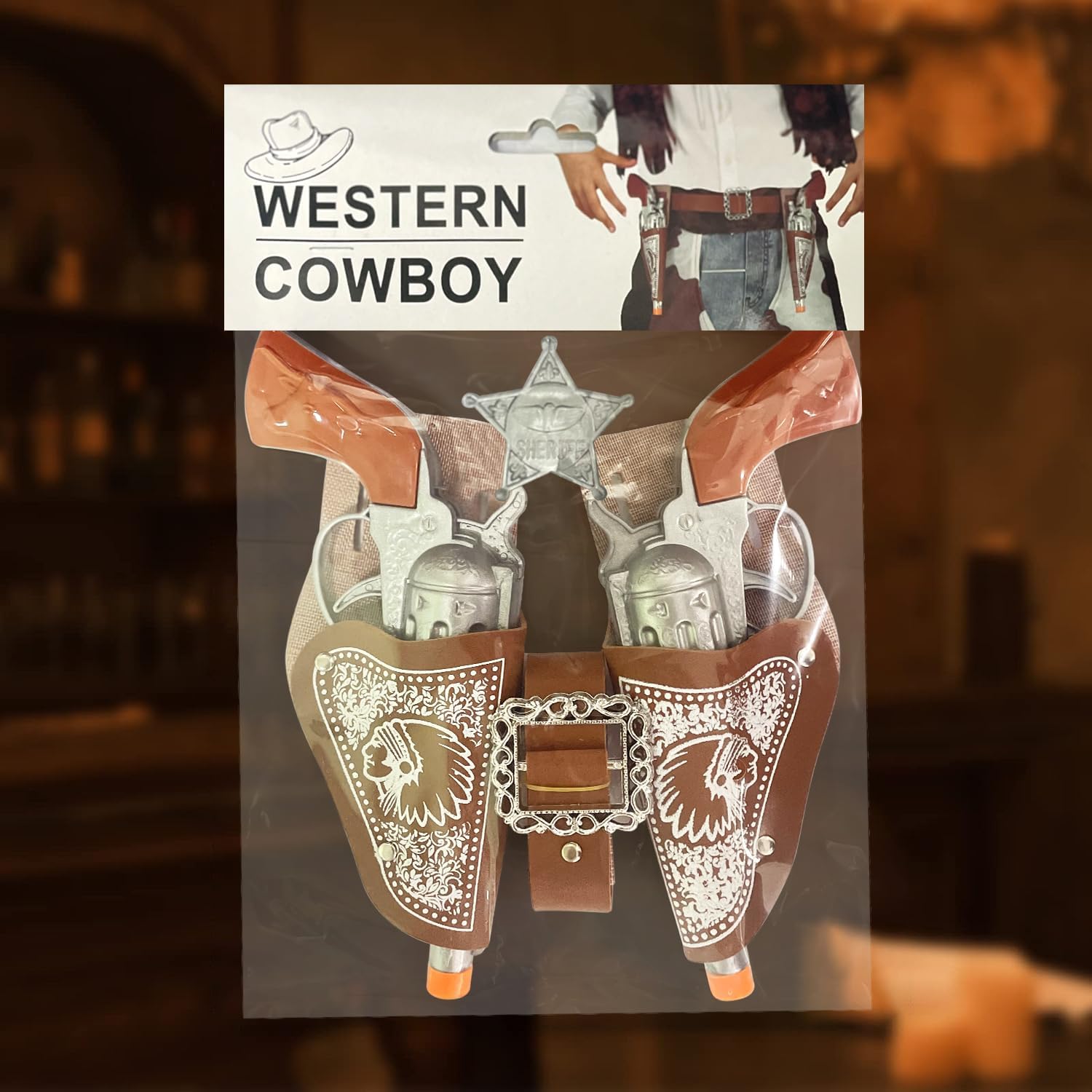 Exquisite Appearance: The classic brown belt and holster show a retro atmosphere, and the two symmetrical holsters are printed with Indian heads, adding an ancient and mysterious feeling. The matching toy guns can emit a simulated gunshot when the trigger is pulled, and the pentagram-shaped sheriff badge makes your outfit more realistic.