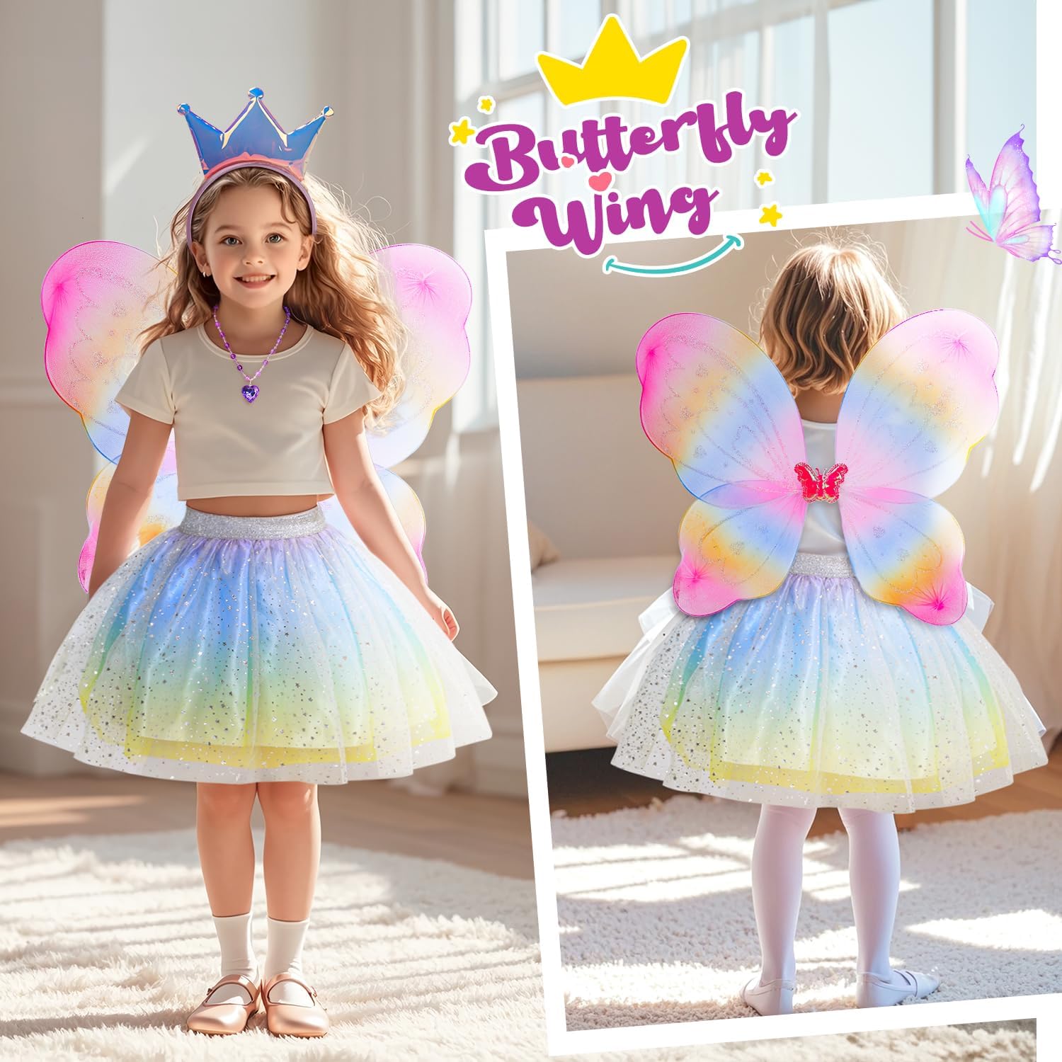 Princess Dress Up Set: Our dress up clothes set includes 1 glitter princess cape, a butterfly wing, 1 tutu skirts, two pairs of princess shoes, 2 wand, 2 necklaces, 2 crown and 2 bracelets. It can satisfy all the needs of little girls for dressing up.