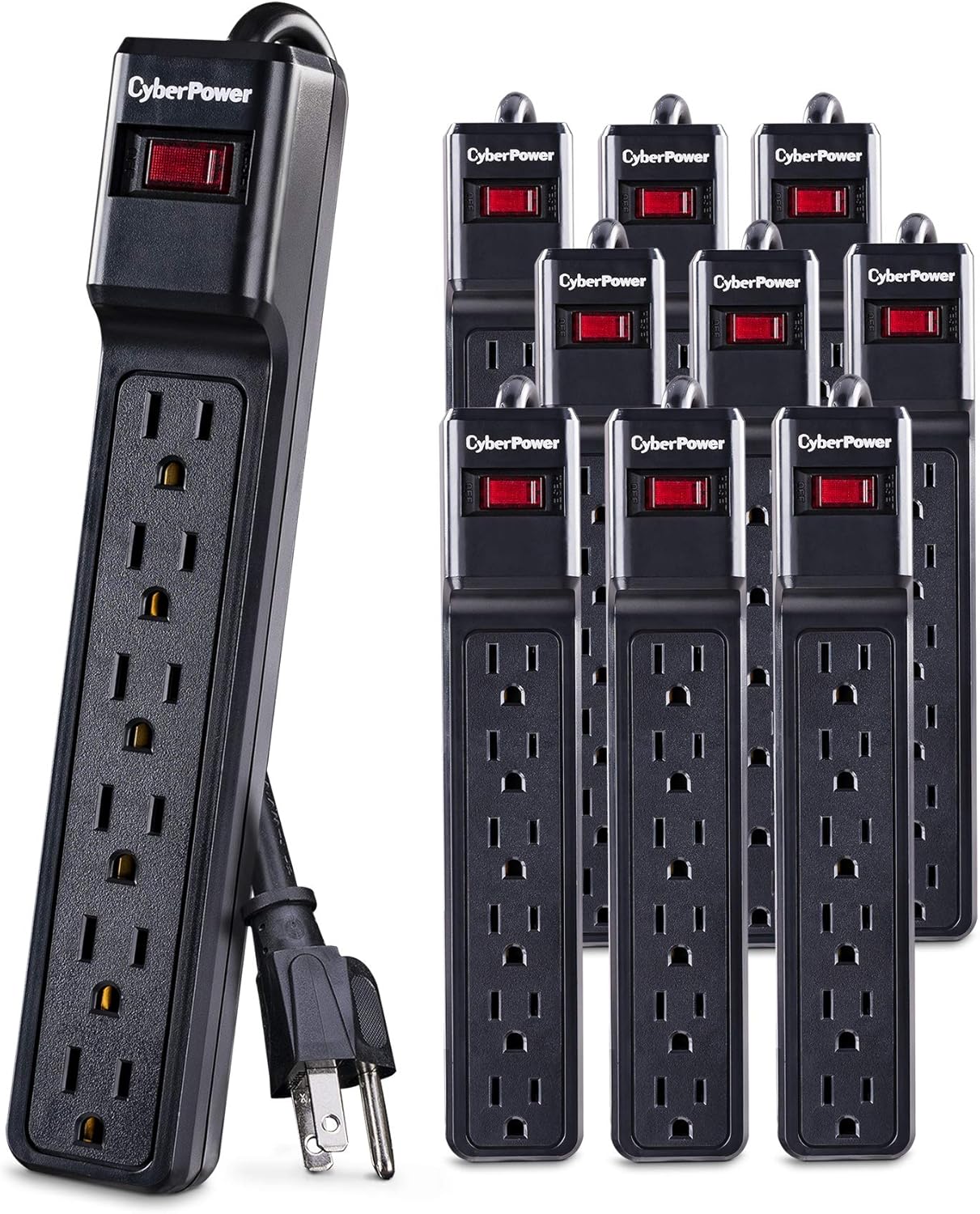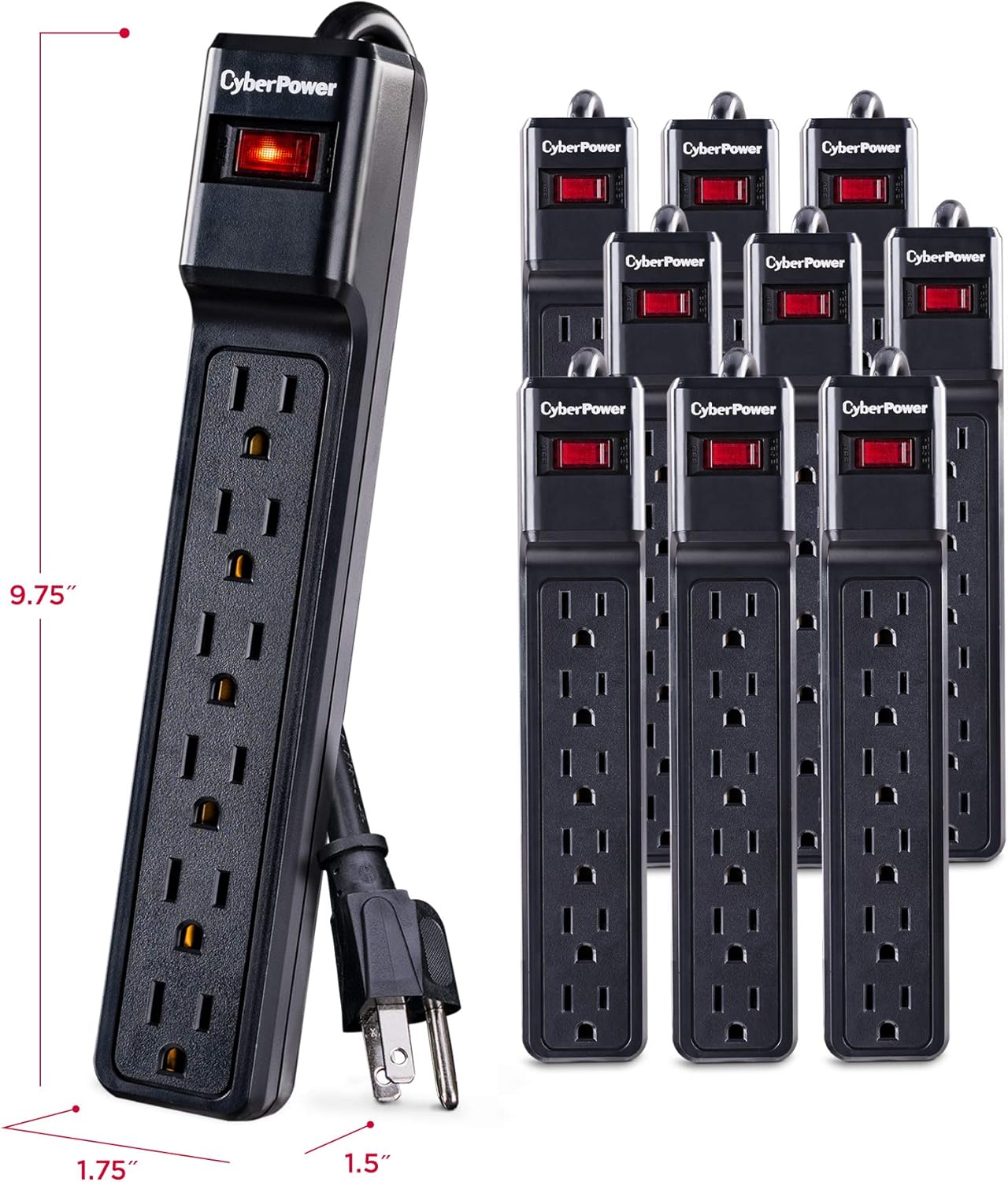 The CyberPower Essential Series CSB6012MP10 Surge Protector is ideal for Home/Office protection with 1,200 joules, 6 outlets, and a 12 ft. cord. The surge protector is ideal for protecting personal computers, phones/fax/modems, printers, stereos, and consumer electronics. The CSB6012MP10 features MOV technology to guard the surge protector and connected electronics against line abnormalities, and lightning surges, while EMI/RFI filters block unwanted line noise. A Limited Lifetime Warranty ensures that this surge protector has passed our highest quality standards in design, assembly, material or workmanship and further protection is offered by a $75,000 Connected Equipment Guarantee.
