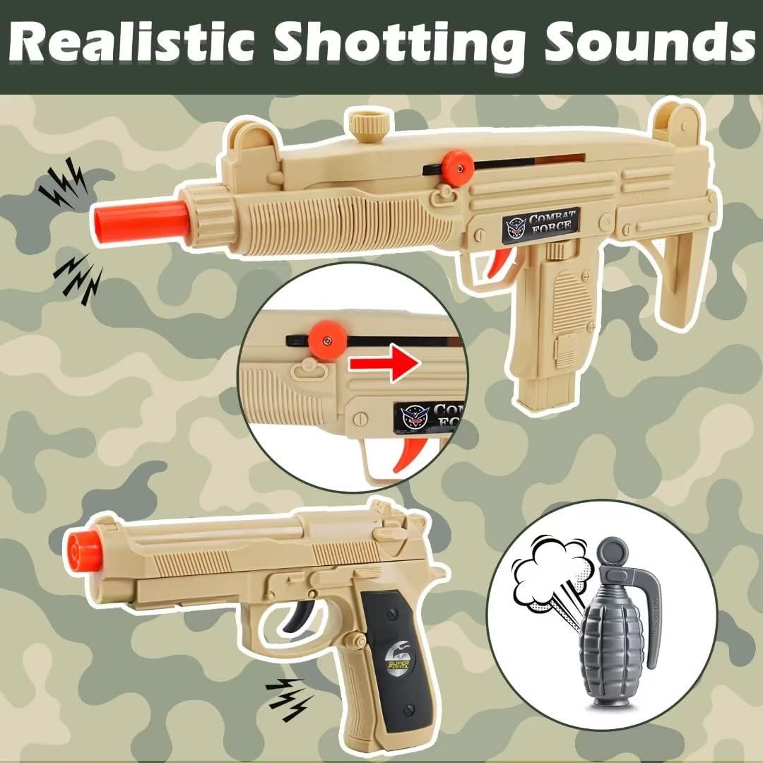 1x camouflage military vest.1x toy helmet.1x toy walkie talkie.1x toy knife.1x toy shotgun.1x toy pistol.1x toy watch.1x pair of glasses.1x toy scope.2x toy grenades.