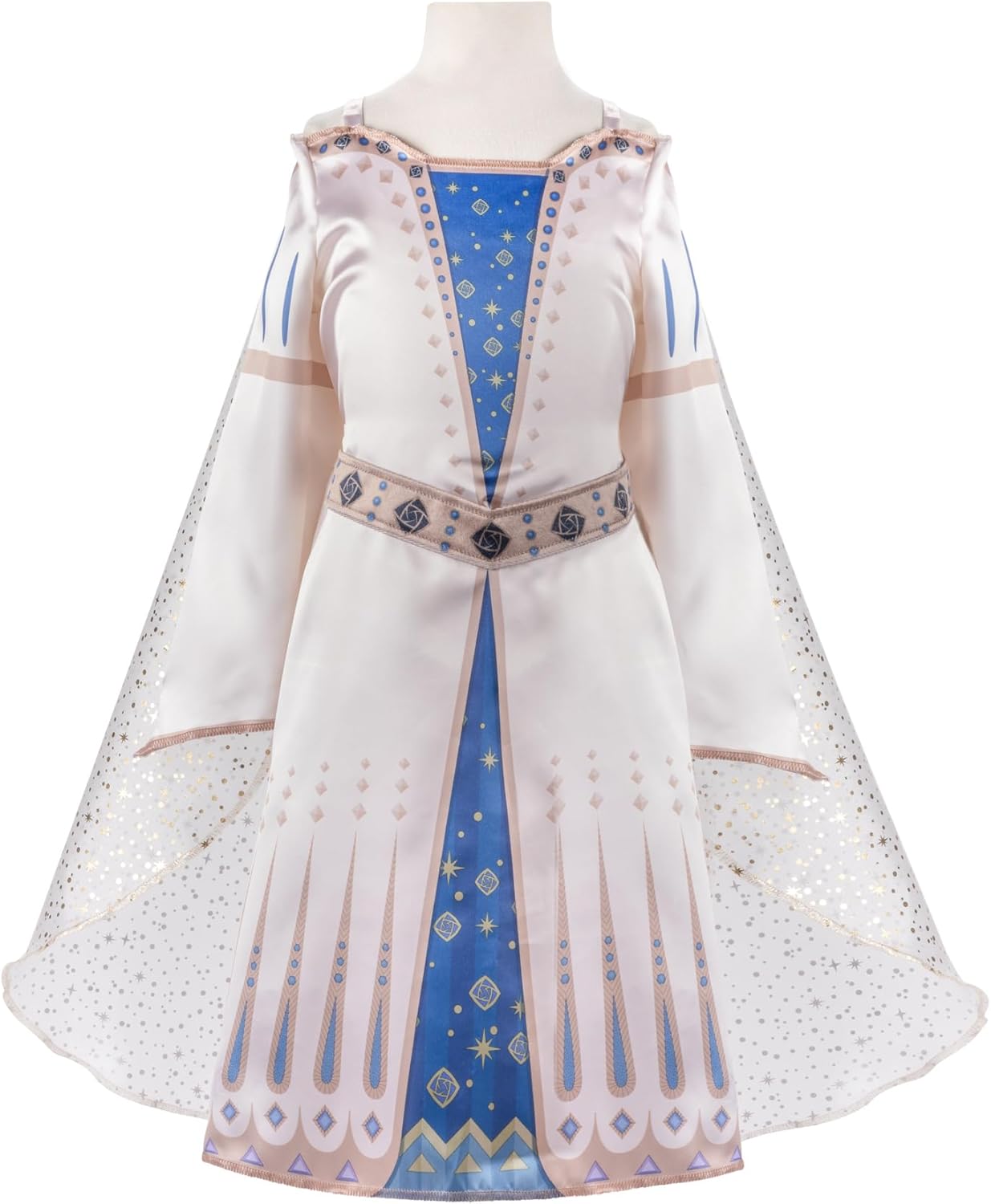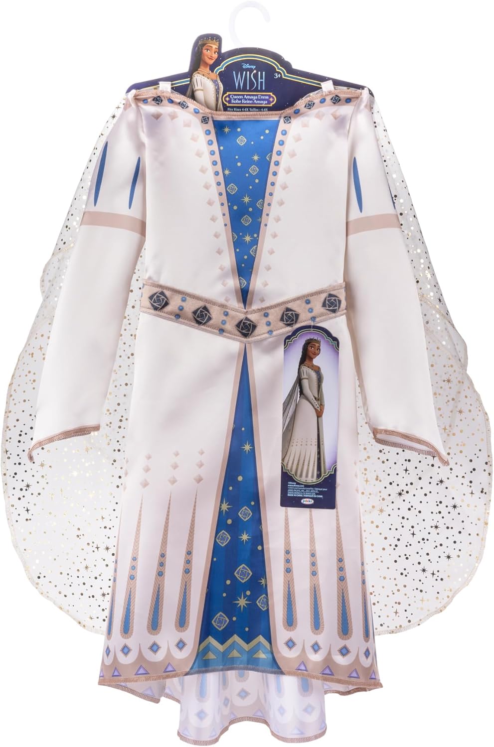 Dress up in Queen Amaya’s signature outfit and imagine that you are the queen of the city of Rosas. Magical adventures await your royal highness in this beautiful long sleeve, silky dress with a gold waistband and trim and featuring an underlayer of shimmering blue with gold stars. A flowing cape adorned in glittery gold completes the look. Let your imagination soar with wishes as you put on this outfit that’s just like what Queen Amaya wears in Disney’s animated film Wish.