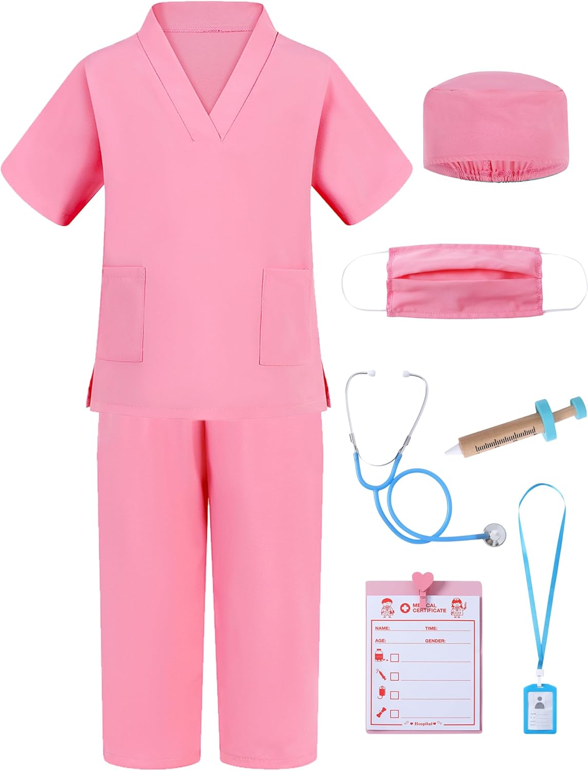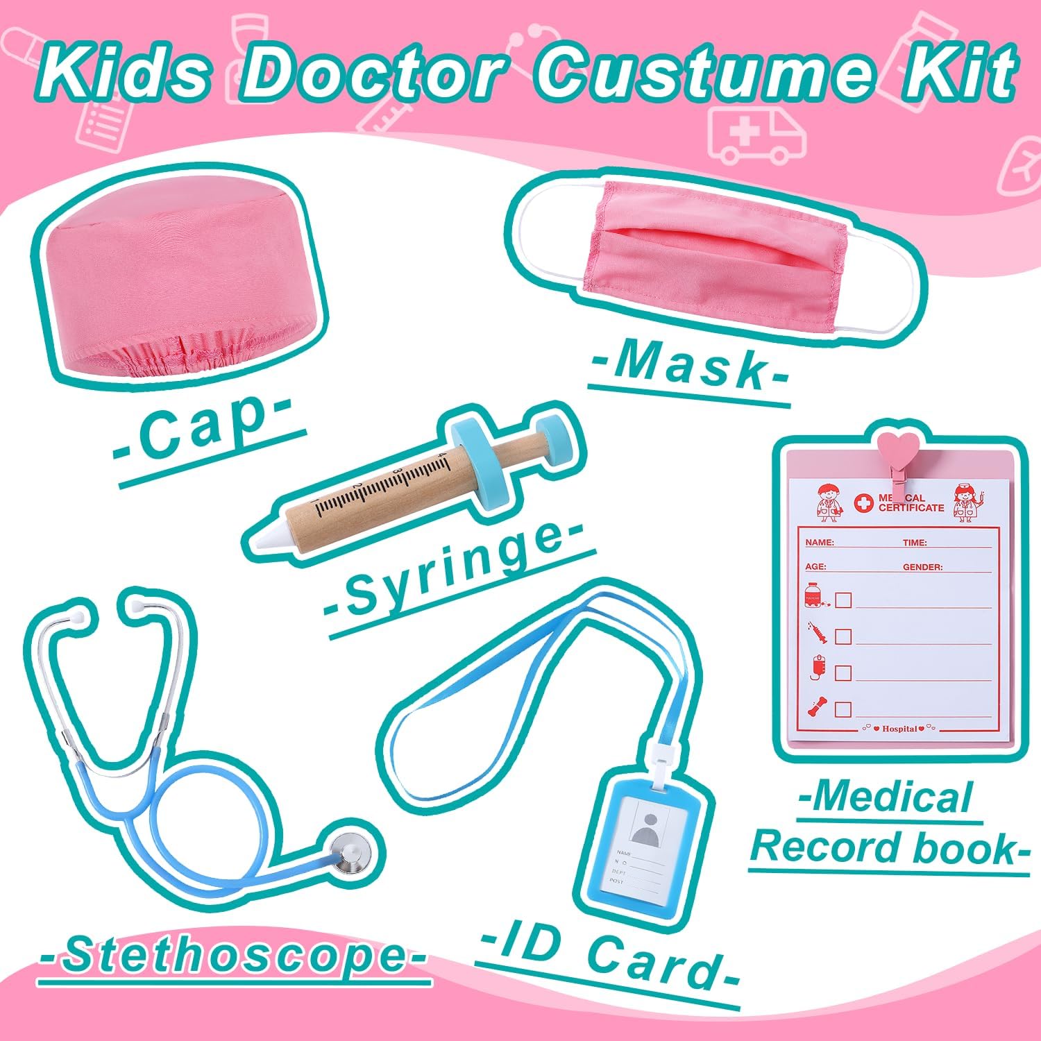 Comes with White Doctor Coat*1, V-neck and Short Sleeve Shirt*1, Pants*1, Cap*1, Mask*1, ID Card*1, Stethoscope Props*1 (Stethoscope really does work!), Wood Syringe Props*1, Medical Record book*1.