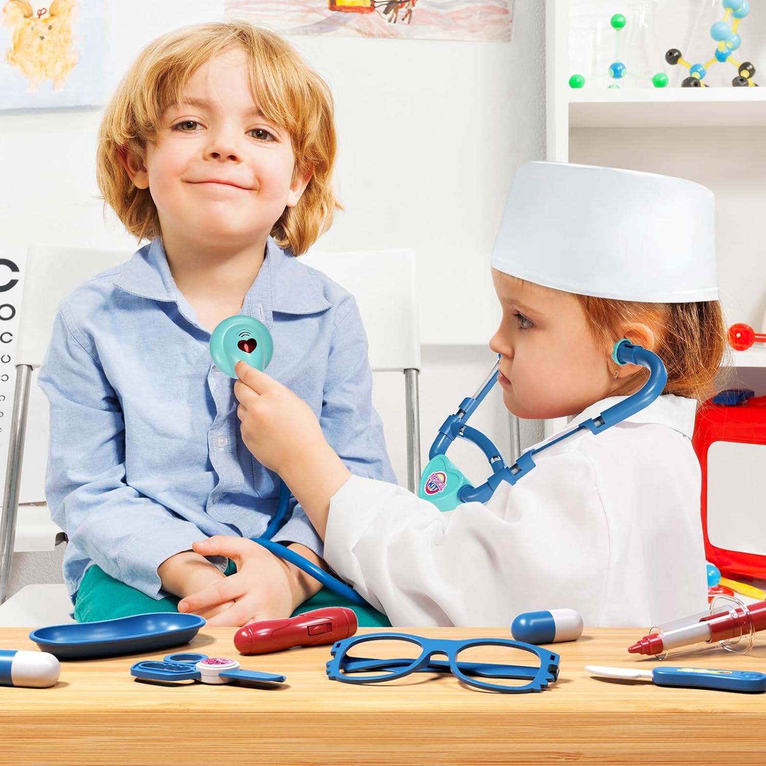 【FULLY ACCESSORY DOCTOR KIT】 The doctor set comes with a syringe, defibrillator, scalpel, pills, doctor clothes and more. The upgraded stethoscope, heart rate monitor, flashlight, and thermometer can produce realistic real-life heartbeat sounds and light effects. Children can learn some basic medical knowledge.