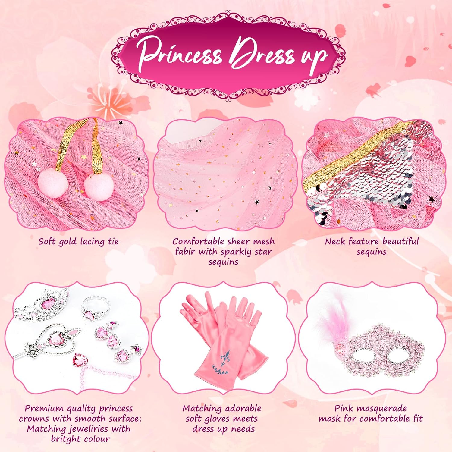 Gorgeous Matching Princess Accessories set: The matching princess jewelry set, paired with a luxurious artificial gems, and gorgeous masquerade mask, princess gloves, which add extra charm to this princess dress up set for girls.