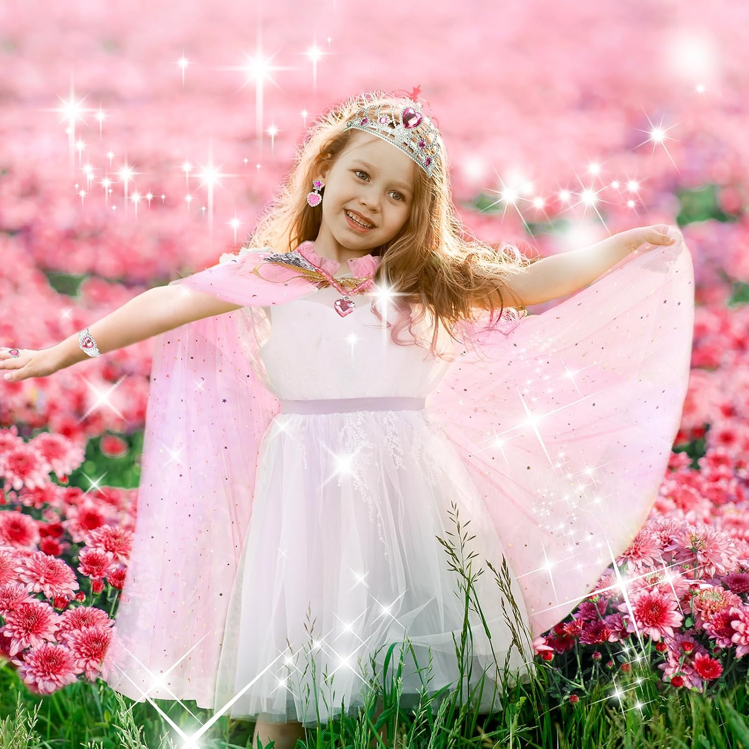 Stylish and Dazzling Princess Cape for Girls: Made of soft and comfy sheer mesh fabric, breathable and durable. Long and lightweight princess cape was full of the sparkly stars and moon everywhere that little girls liked.The sparkly star sequins that don’t fall off, no mess worries. Easy to put on and take off.