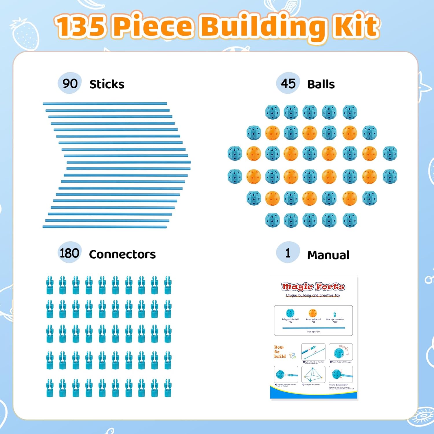 EASY TO BUILD – Can be taken apart, repositioned, moved around and put back together again. With connectors, it is easier to set up and take down than others! It comes with everything you need to create a beautiful, sturdy construction toy. With 45 balls, 90 rods and 180 connectors, plus an instruction booklet, this is the ultimate fort building kit.
